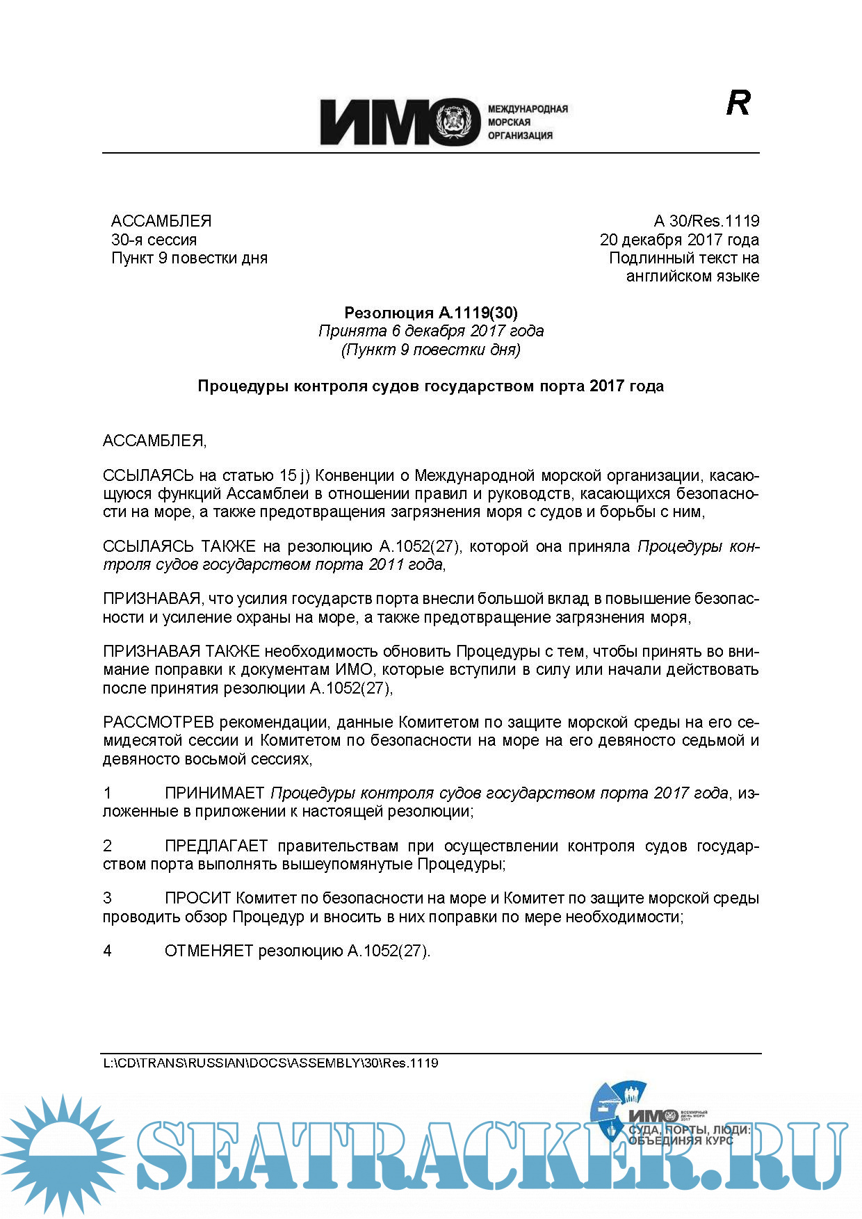 Приводится на русском и английском языках текст резолюции А.1119(30) Международной морской организации (ИМО) — «Процедуры контроля судов государством порта 2017 года», принятой на 30-й сессии Ассамблеи ИМО (27 ноября — 6 декабря 2017 г.)