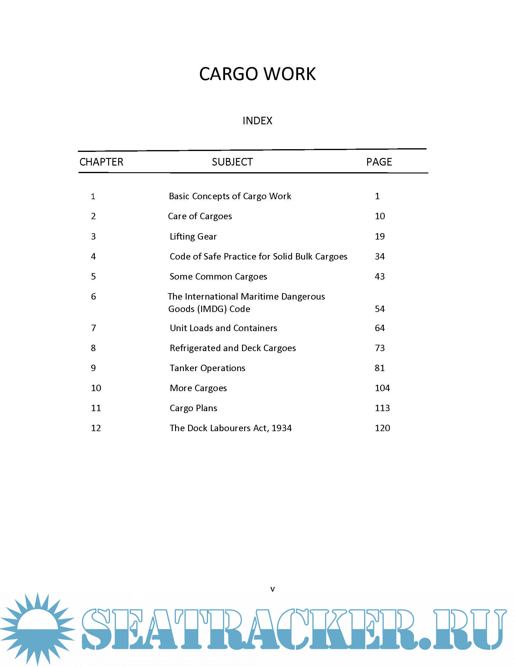 1.Basic Concepts of Cargo Work 2.Care of Cargoes 3.Lifting Gear 4.Code of Safe Practice for Solid Bulk Cargoes 5.Some Common Cargoes 6.The International Maritime Dangerous Goods (IMDG) Code 7.Unit Loads and Containers 8.Refrigerated and Deck Cargoes 9.Tanker Operations 10.More Cargoes 11.Cargo Plans 12.The Dock Labourers Act, 1934