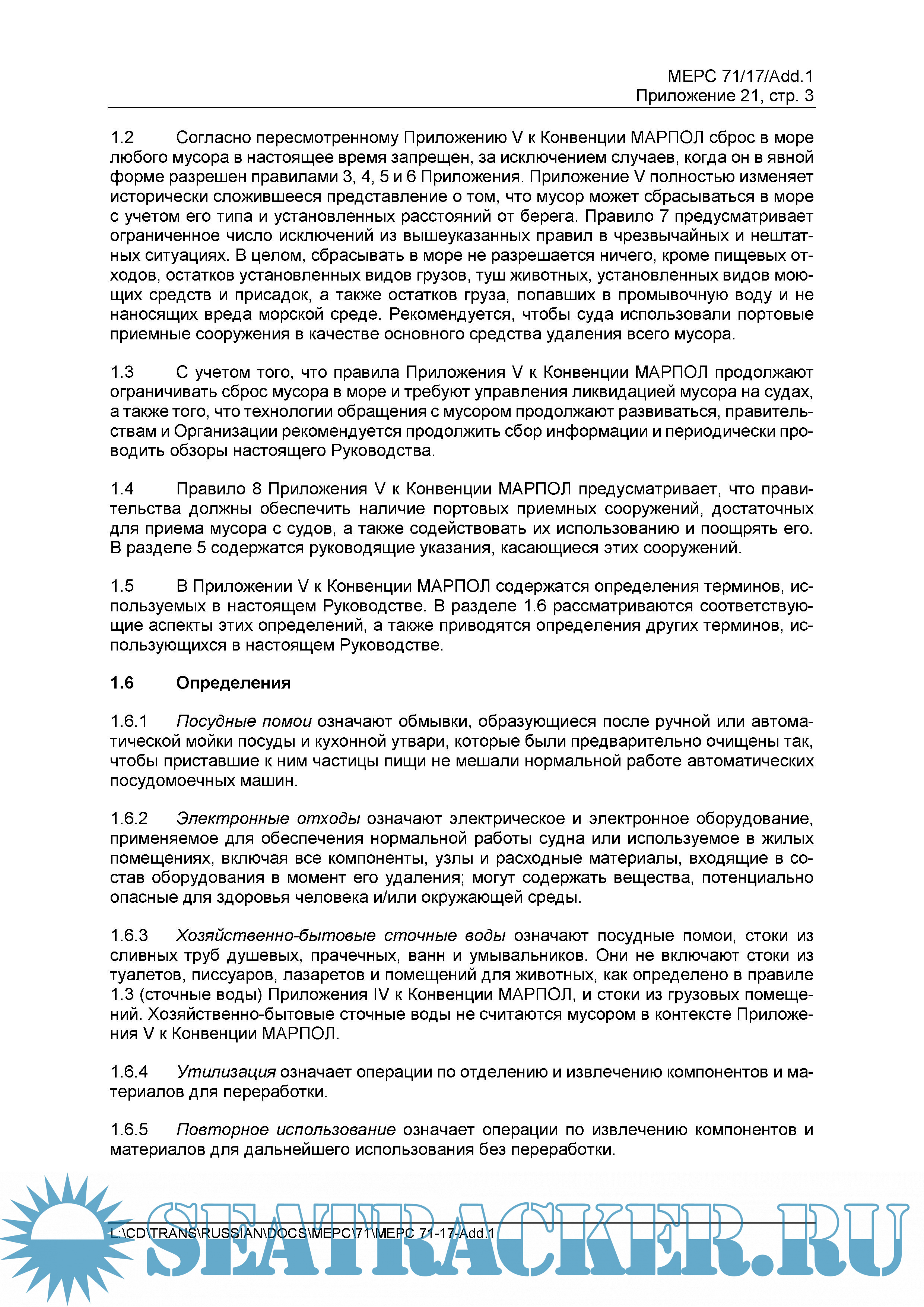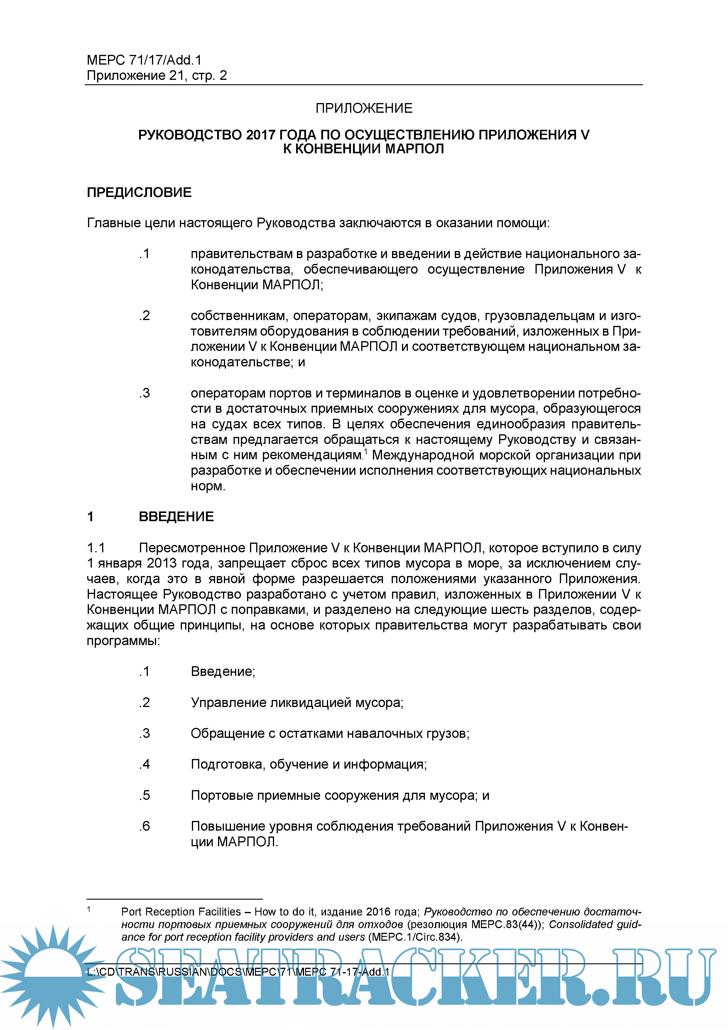 Год выпуска: 2017 Язык: русский Автор: ИМО. Комитет по защите морской среды (КЗМС) Жанр: Руководство Формат: PDF Качество: Неизвестно Количество страниц: 35 Описание: РУКОВОДСТВО 2017 ГОДА ПО ОСУЩЕСТВЛЕНИЮ ПРИЛОЖЕНИЯ V К КОНВЕНЦИИ МАРПОЛ Комитетом по защите морской среды (КЗМС) были приняты новые Резолюции (MEPC) в отношении поправок к Международной конвенции по предотвращению загрязнения с судов 1973 года (МК МАРПОЛ). В частности приняты поправки к Приложению V, которые вступают в силу с 1 марта 2018 г. (резолюция МЕРС.277(70), резолюция МЕРС.295(71)). РЕЗОЛЮЦИЯ MEPC.295(71) (принята 7 июля 2017 года) РУКОВОДСТВО 2017 ГОДА ПО ОСУЩЕСТВЛЕНИЮ ПРИЛОЖЕНИЯ V К КОНВЕНЦИИ МАРПОЛ ПРЕДИСЛОВИЕ Главные цели настоящего Руководства заключаются в оказании помощи: .1 правительствам в разработке и введении в действие национального законодательства, обеспечивающего осуществление Приложения V к Конвенции МАРПОЛ; .2 собственникам, операторам, экипажам судов, грузовладельцам и изготовителям оборудования в соблюдении требований, изложенных в Приложении V к Конвенции МАРПОЛ и соответствующем национальном законодательстве; и .3 операторам портов и терминалов в оценке и удовлетворении потребности в достаточных приемных сооружениях для мусора, образующегося на судах всех типов. В целях обеспечения единообразия правительствам предлагается обращаться к настоящему Руководству и связанным с ним рекомендациям Международной морской организации при разработке и обеспечении исполнения соответствующих национальных норм. Английский язык является одним из официальных и, в отличие от русского, рабочим языком ИМО. По этой причине, в случаях каких-либо разночтений, предпочтение должно отдаваться тексту на английском языке (ссылка