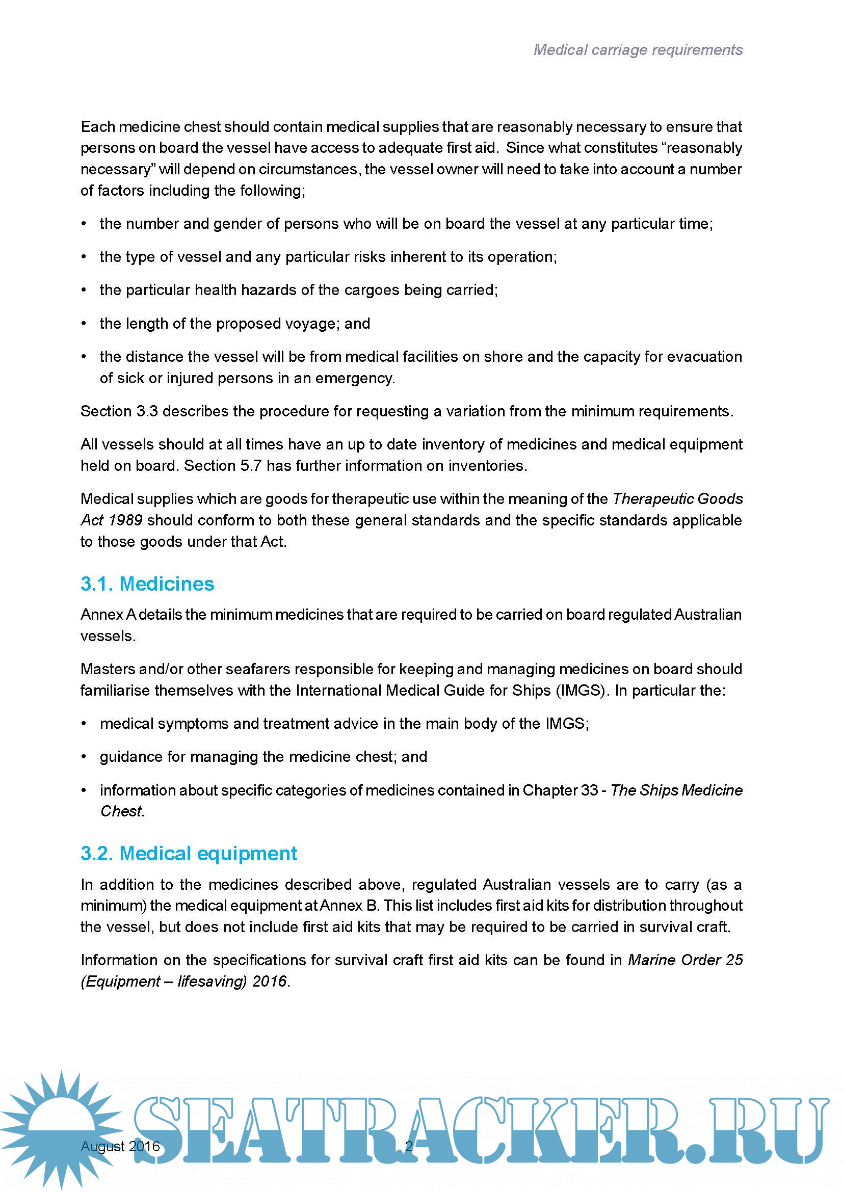 Year: 2016 Language: english Author: AMSA Genre: Guide Format: PDF Quality: eBook Pages count: 28 Description: Regulated Australian vessels must be equipped with a medicine chest that contains the medicines and medical equipment that would allow an appropriately trained person to treat injuries and illnesses on board the vessel until a patient can be transferred to the care of a medical practitioner. The information provided in this document is derived from international medical publications, in particular the International Medical Guide for Ships and its Quantification Addendum. Marine Order 11 requires that each regulated Australian vessel carries a copy of the most recent edition of the International Medical Guide for Ships to assist in the diagnosis and treatment of sick and injured seafarers.