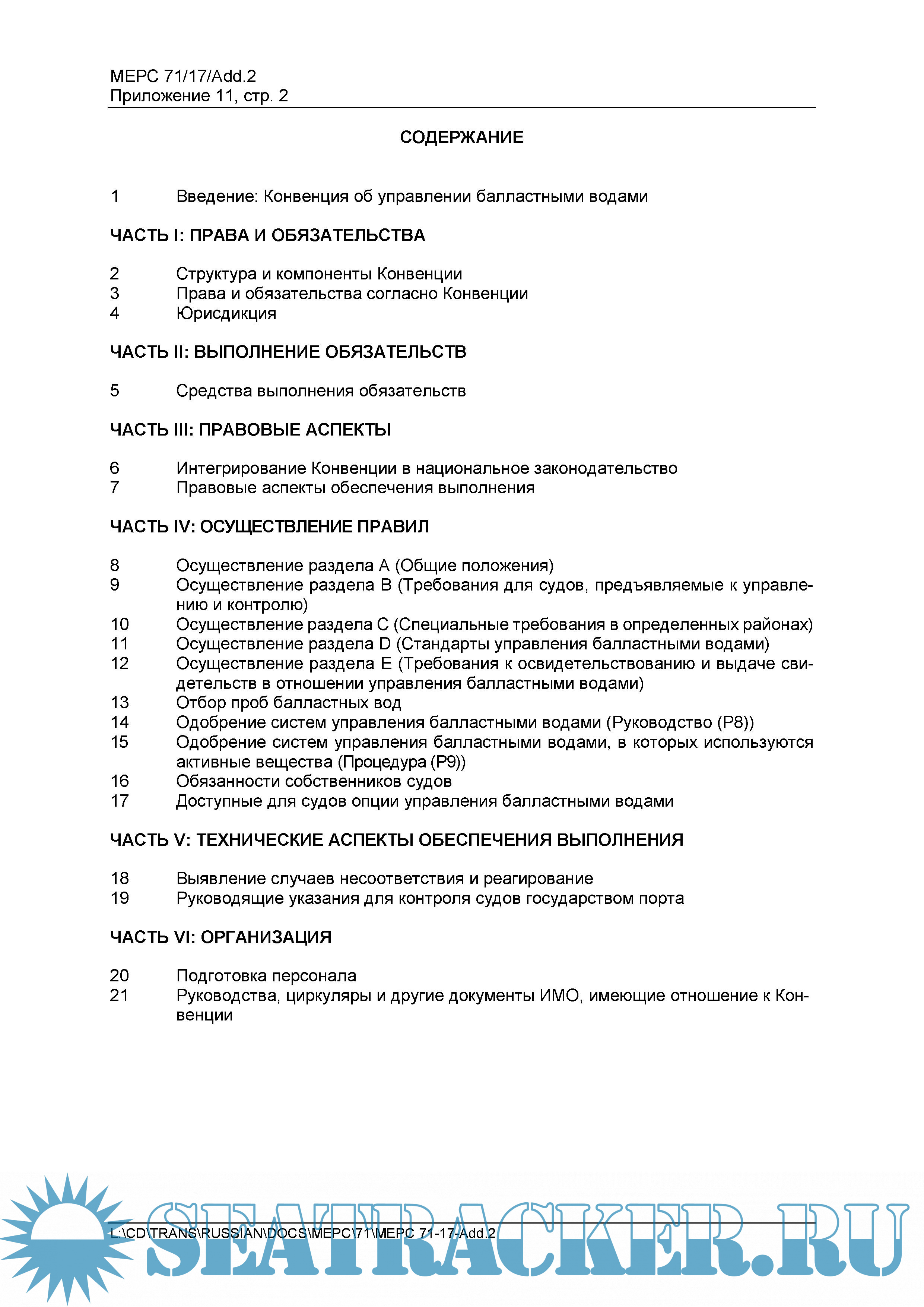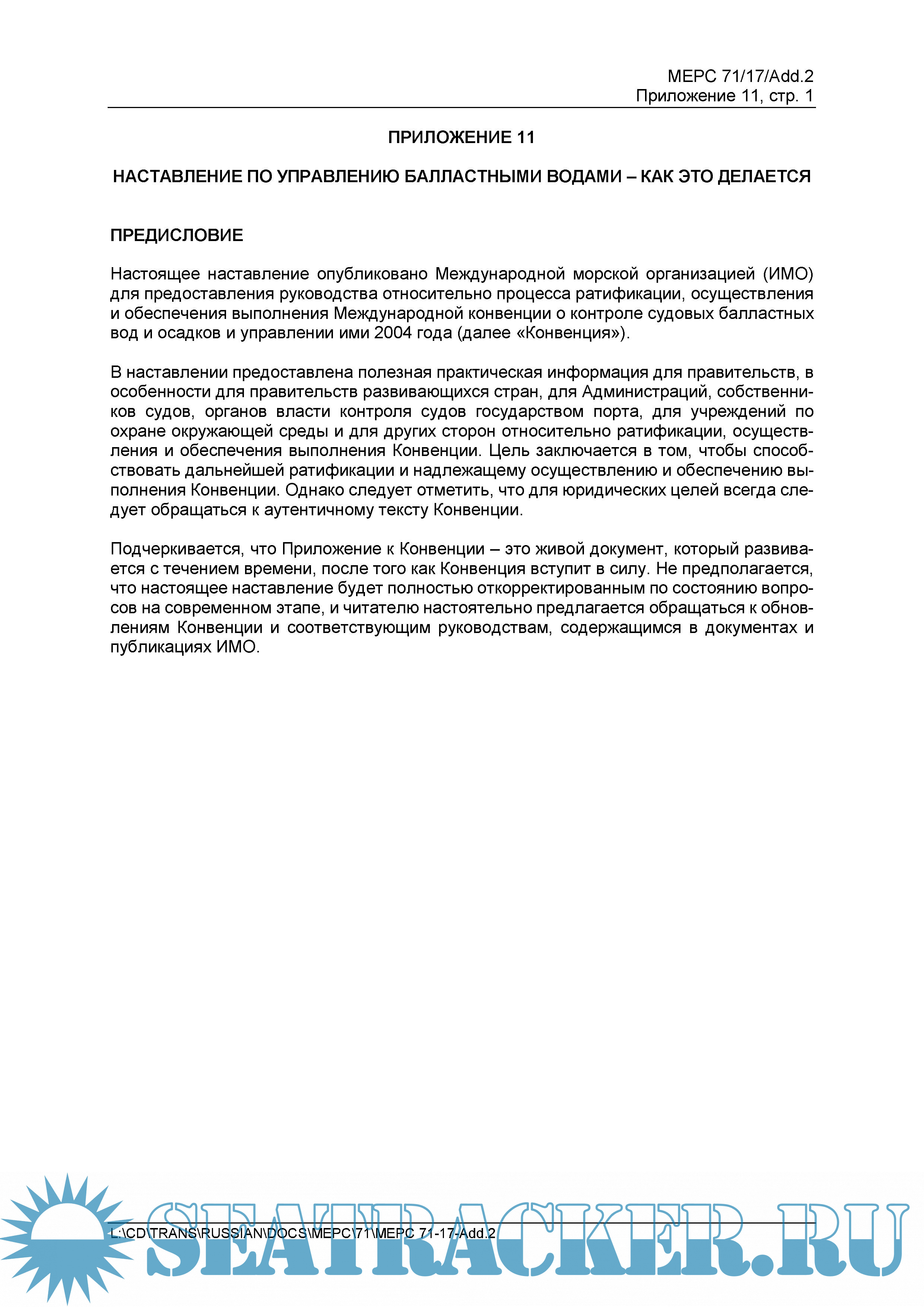 Настоящее наставление опубликовано Международной морской организацией (ИМО) для предоставления руководства относительно процесса ратификации, осуществления и обеспечения выполнения Международной конвенции о контроле судовых балластных вод и осадков и управлении ими 2004 года (далее «Конвенция»).