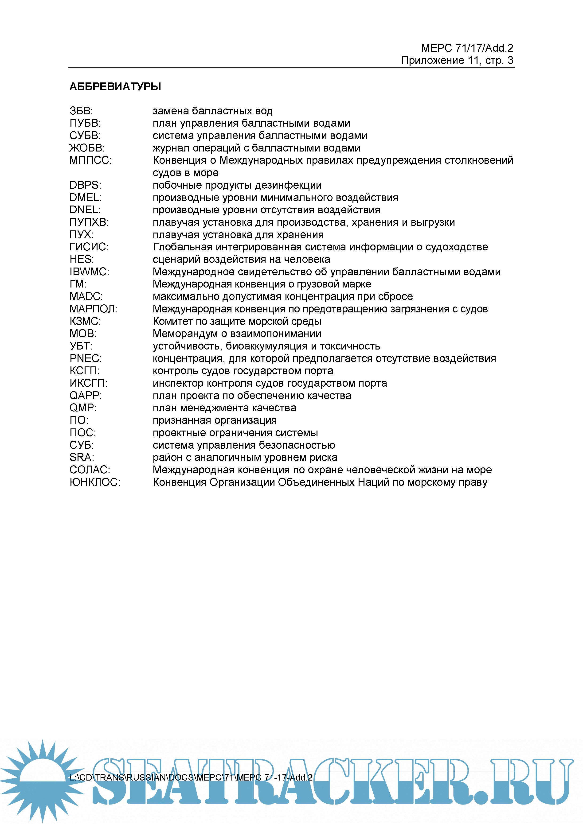 Год выпуска: 2017 Язык: русский Автор: ИМО. Комитет по защите морской среды (КЗМС) Жанр: Руководство Издательство: IMO Издание: Product Code: I624E ISBN: 978-92-801-1681-6 Формат: PDF Качество: Неизвестно Количество страниц: 66 Описание: Настоящее наставление опубликовано Международной морской организацией (ИМО) для предоставления руководства относительно процесса ратификации, осуществления и обеспечения выполнения Международной конвенции о контроле судовых балластных вод и осадков и управлении ими 2004 года (далее «Конвенция»). В наставлении предоставлена полезная практическая информация для правительств, в особенности для правительств развивающихся стран, для Администраций, собственников судов, органов власти контроля судов государством порта, для учреждений по охране окружающей среды и для других сторон относительно ратификации, осуществления и обеспечения выполнения Конвенции. Цель заключается в том, чтобы способствовать дальнейшей ратификации и надлежащему осуществлению и обеспечению выполнения Конвенции. Однако следует отметить, что для юридических целей всегда следует обращаться к аутентичному тексту Конвенции. Подчеркивается, что Приложение к Конвенции – это живой документ, который развивается с течением времени, после того как Конвенция вступит в силу. Не предполагается, что настоящее наставление будет полностью откорректированным по состоянию вопросов на современном этапе, и читателю настоятельно предлагается обращаться к обновлениям Конвенции и соответствующим руководствам, содержащимся в документах и публикациях ИМО. Английский язык является одним из официальных и, в отличие от русского, рабочим языком ИМО. По этой причине, в случаях каких-либо разночтений, предпочтение должно отдаваться тексту на английском языке (https://seatracker.xyz/viewtopic.php?t=26842).