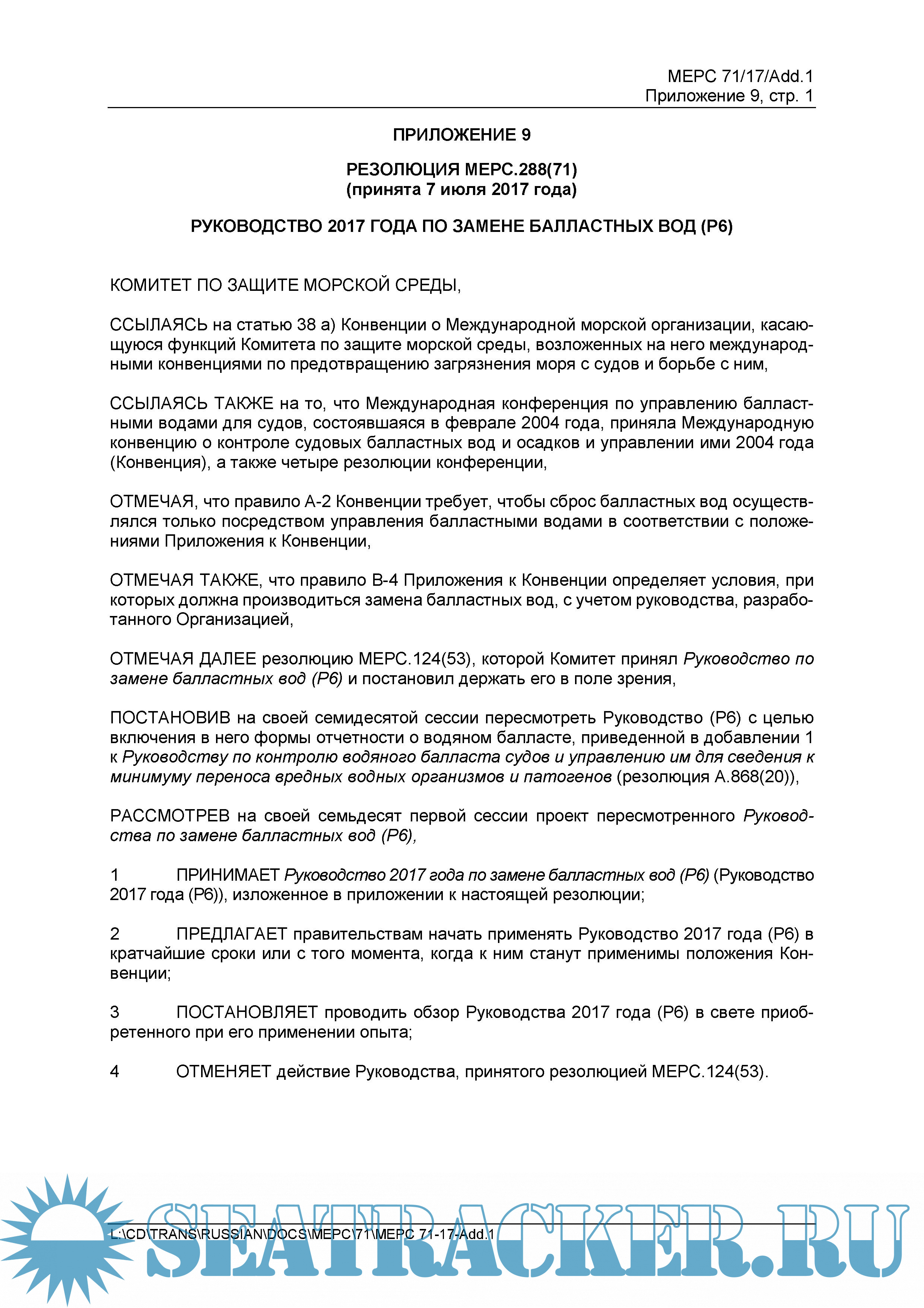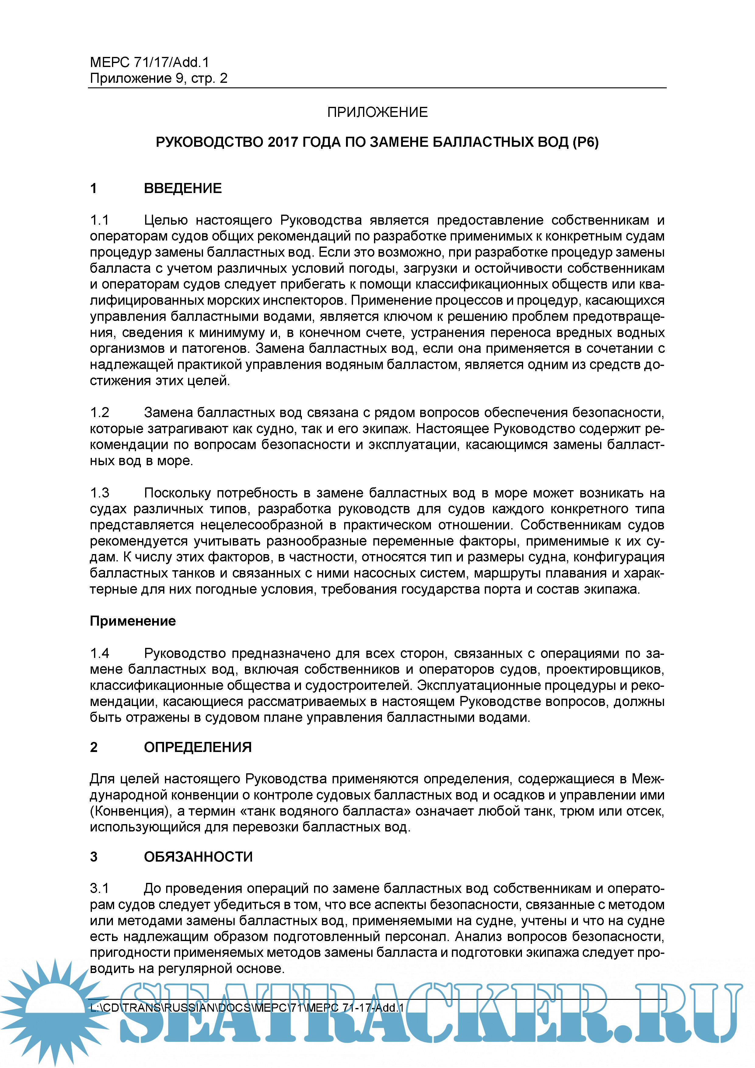 Год выпуска: 2017 Язык: русский Автор: ИМО. Комитет по защите морской среды (КЗМС) Жанр: Руководство Издательство: IMO Формат: PDF Качество: Неизвестно Количество страниц: 10 Описание: РЕЗОЛЮЦИЯ MEPC.288(71) (принята 7 июля 2017 года) РУКОВОДСТВО 2017 ГОДА ПО ЗАМЕНЕ БАЛЛАСТНЫХ ВОД (Р6) Целью настоящего Руководства является предоставление собственникам и операторам судов общих рекомендаций по разработке применимых к конкретным судам процедур замены балластных вод. Если это возможно, при разработке процедур замены балласта с учетом различных условий погоды, загрузки и остойчивости собственникам и операторам судов следует прибегать к помощи классификационных обществ или квалифицированных морских инспекторов. Применение процессов и процедур, касающихся управления балластными водами, является ключом к решению проблем предотвращения, сведения к минимуму и, в конечном счете, устранения переноса вредных водных организмов и патогенов. Замена балластных вод, если она применяется в сочетании с надлежащей практикой управления водяным балластом, является одним из средств достижения этих целей. ОТМЕНЯЕТ действие Руководства, принятого резолюцией MEPC.124(53). Английский язык является одним из официальных и, в отличие от русского, рабочим языком ИМО. По этой причине, в случаях каких-либо разночтений, предпочтение должно отдаваться тексту на английском языке (ссылка https://seatracker.xyz/viewtopic.php?t=26838)