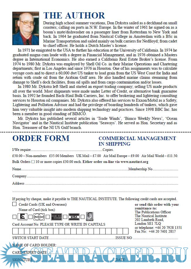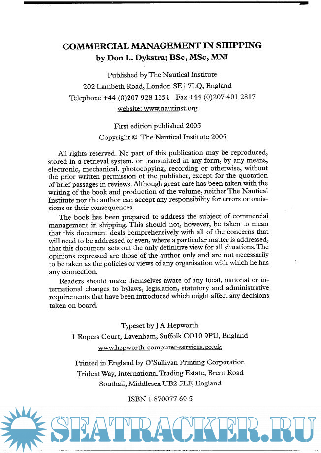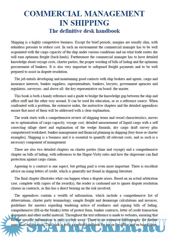 Year: 2005 Language: english Author: Don L. Dykstra Genre: Textbook Publisher: The Nautical Institute Edition: First ISBN: 1870077695 Format: PDF Quality: Scanned pages Pages count: 496 Description: This book is a handy reference and a guide that covers the gap between the vessel and the office staff, and vice versa. It aims at achieving three main objectives: (1) the competent handling of shipping contracts, (2) the accurate calculation of voyage-costs, and (3) the effective commercial communication between the vessel and various interests ashore. It can successfully serve both as a textbook for education purposes, and as a reference book for everyday work. In the beginning, the volume reviews the basic shipping terms and ship characteristics, and then addresses the optimization of utilizing the available cargo capacity. The next chapters address the costs of voyage, liquid cargo measurement, draft survey of the dry cargo, bunker management, finance planning applied to shipping, computerization and other important aspects of commercial shipping. Two more chapters are devoted to the bills of lading and charter parties, while the final one addresses the disputes and arbitration. Finally, the book is filled with real practical examples, and its value as a reference work, derives from its comprehensive index. It also contains an extensive Reference List of sources of information. In a hard-copy format, it can be a valuable addition to the book-selves of the offices of shipping firms and on-board of their vessels.