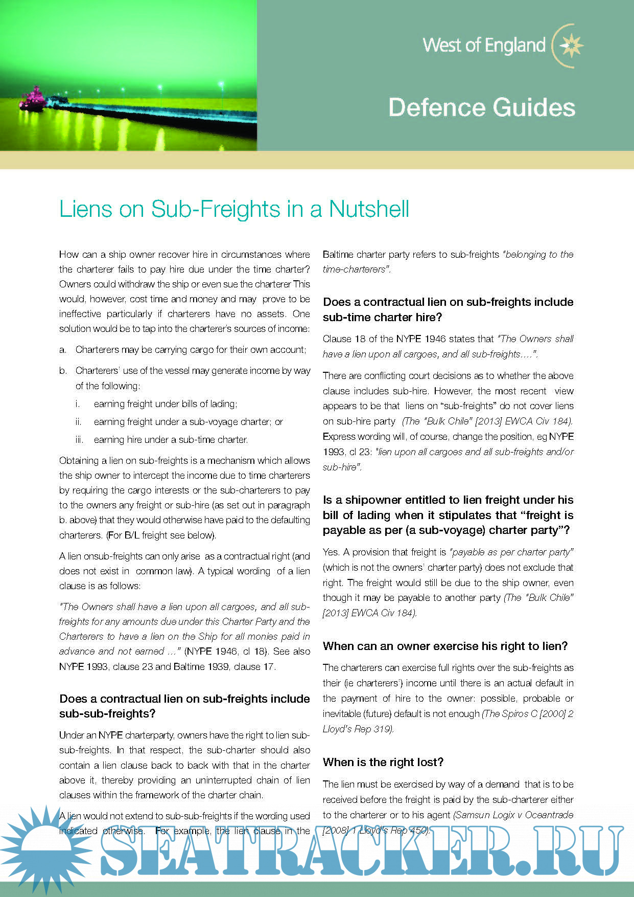 P&I Cover - Claims Guides These guides provide Members with information and advice on some P&I claims topics: 1. Diversion expense claims 2. A Vessel Owner's Guide to Claims Under The United States Longshore and Harbor Workers' Compensation Act 3.Bunker Quality Disputes Part 2: Legal and Claims Handling Considerations 4. Incorporation of Charter Party Terms into Bills of Lading 5. Paperless trading - electronic bills of lading 6. Bills of Lading 5 - Cargo Claimants' Rights & Liabilities 7. Bills of Lading 4 - Cargo Shortage Claims 8. Bills of Lading 3 - Issues with Quantity & Quality of Cargo at Loadport 9. Bills of Lading 2 - Letters of Indemnity 10. Bills of Lading 1 - Functions of a Bill of Lading 11. IMO's Low Sulphur Fuel Limit Under Marpol Annex VI Defence Cover – “In a Nutshell” Guides 12. Interruptions and Exceptions to Laytime 13. Safe Ports and Berths 14. Off-Hire 15. Notices of redelivery 16. Late Redelivery 17. Early Redelivery 18. Speed and Consumption 19. Hull Fouling 20. Withdrawal and suspension of service of a ship 21. Liens on hire / sub-freight 22. Hold cleaning 23. Liens on cargo 24. Notices of Readiness 25. Clause Paramount 26. Cancellation 27. Disponent owners’ contractual risks