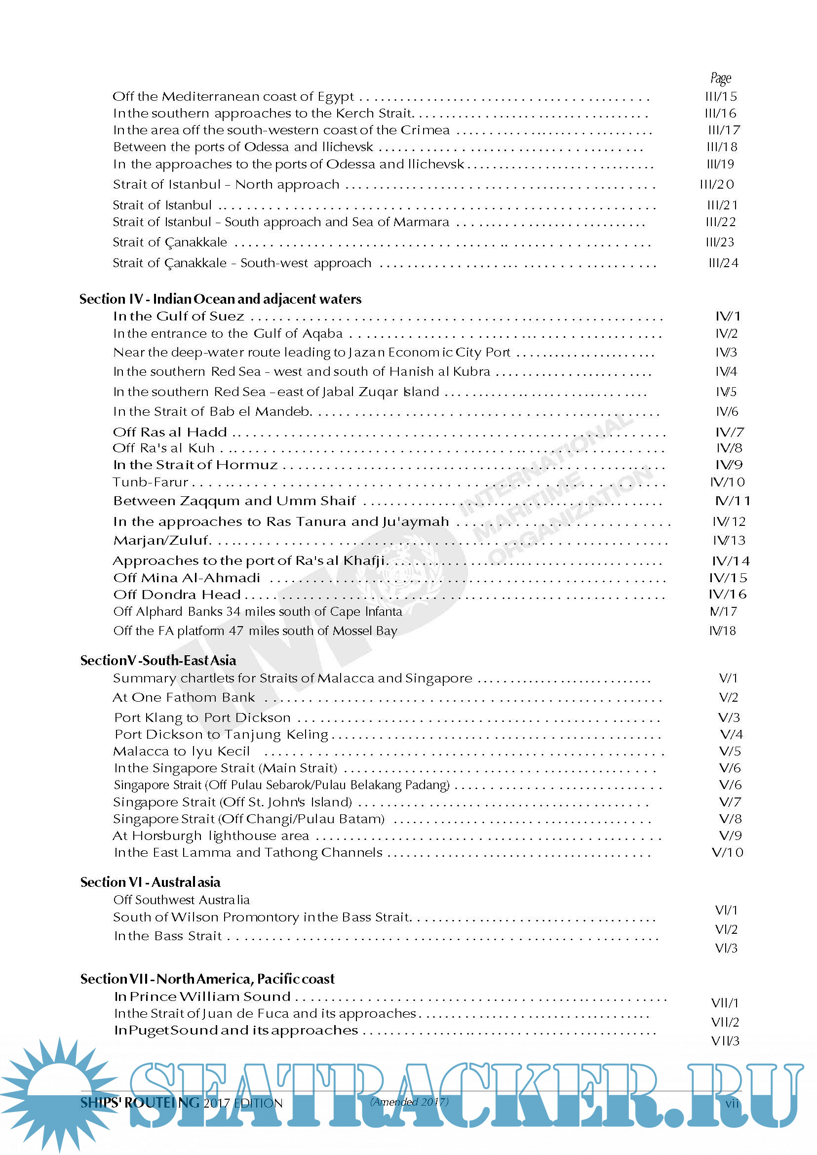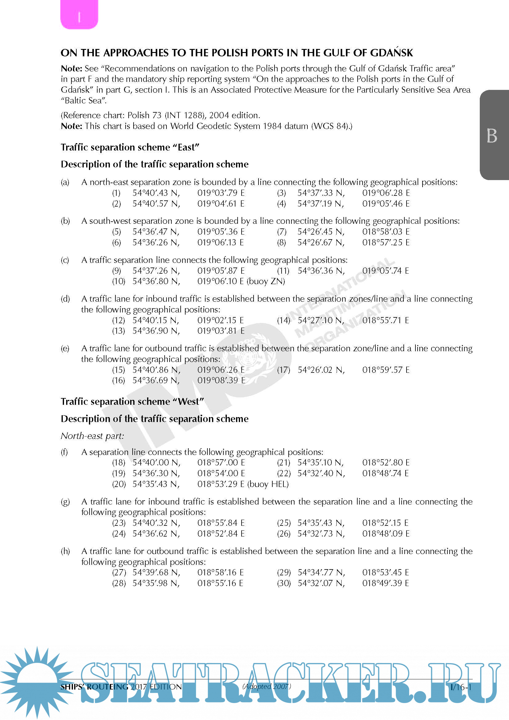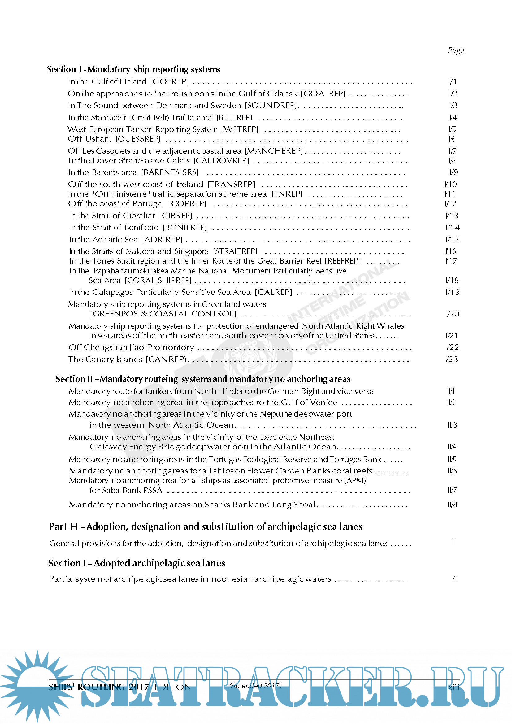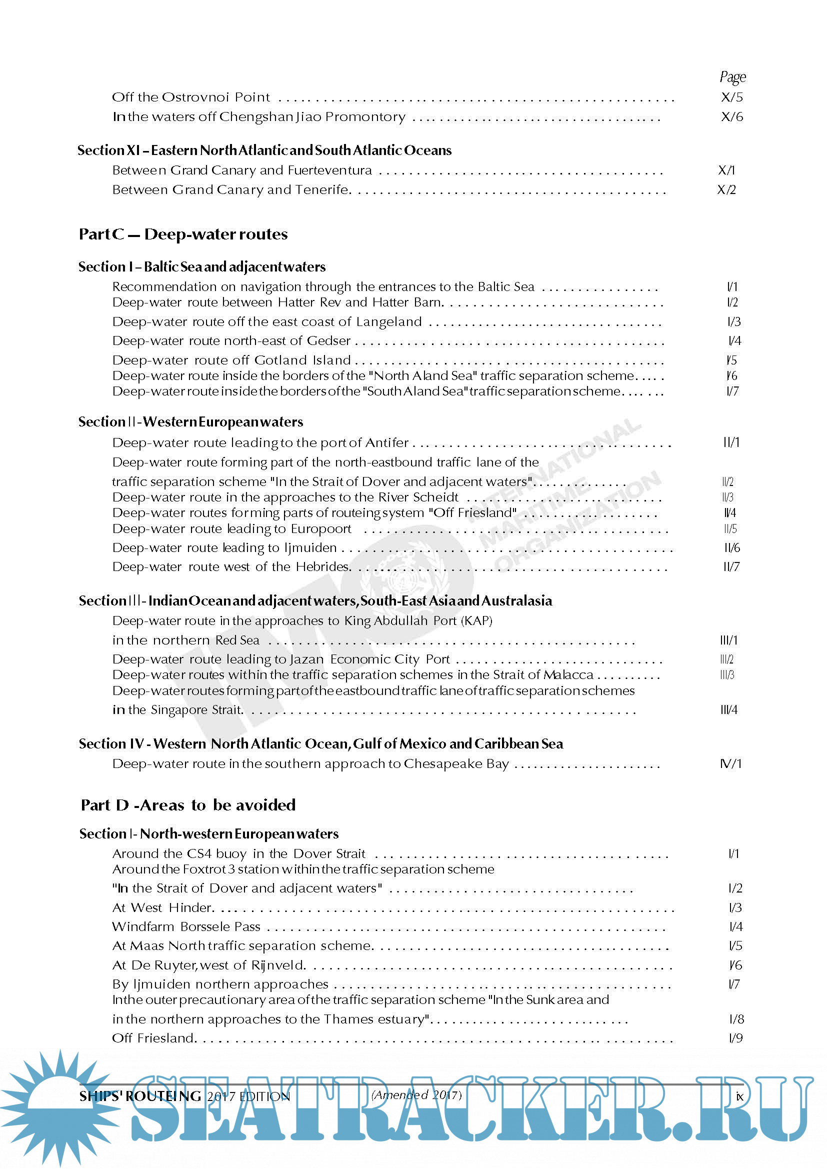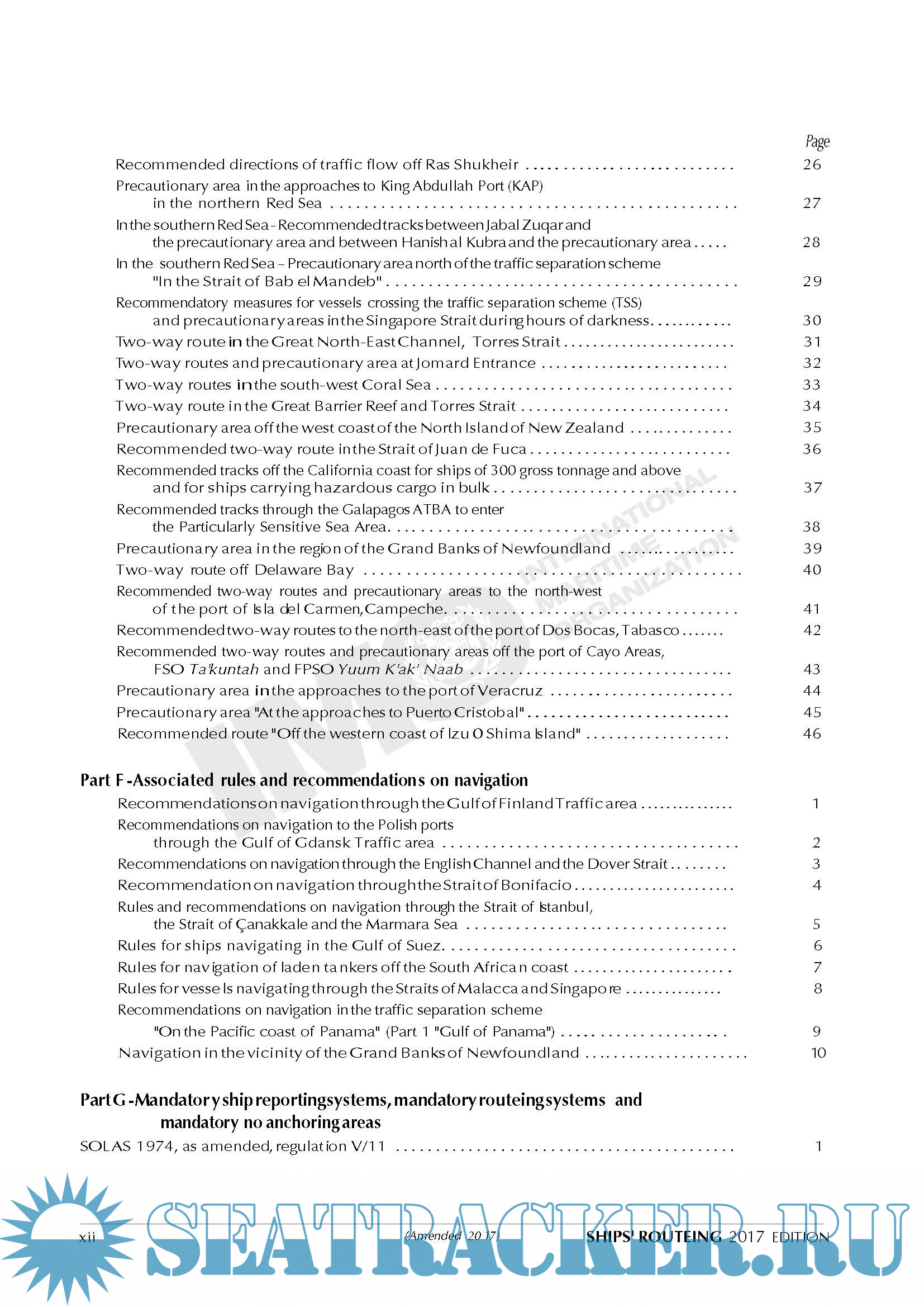 Description: Both the safety of shipping and the cleanliness of oceans are promoted in many ways, one of which is the continuing development of routeing measures to control the navigation of vessels and to monitor their progress. The measures that are described or defined in parts A and H of this publication are individually described in parts B (traffic separation schemes and inshore traffic zones), C (deep-water routes), D (areas to be avoided), E (other routeing measures, such as recommended tracks, two-way routes and recommended directions of traffic flow), F (the rules and recommendations on navigation that are associated with particular traffic areas and straits), G (mandatory ship reporting systems, mandatory routeing systems and mandatory no anchoring areas) and H (archipelagic sea lanes).