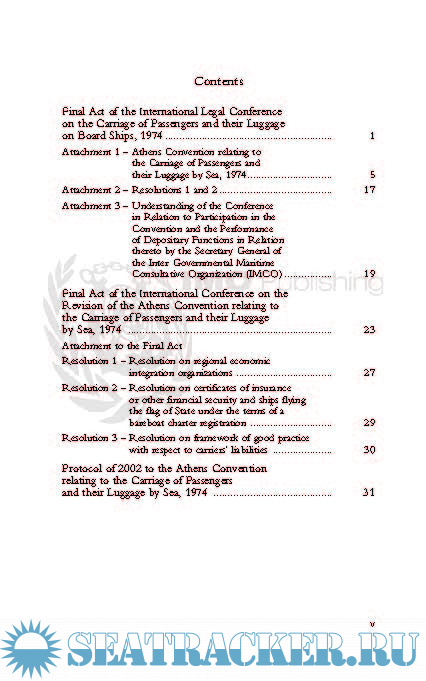 Year: 2003 Language: english Author: IMO Genre: Convention (rules) Edition: 2003 ISBN: 92-801-4161-9 Format: PDF Quality: eBook Pages count: 57 Description: Concerns the carriage of passengers and their luggage by sea and the establishment of a regime of liability for damage suffered by passengers carried on a seagoing vessel. This publication includes: Final Act of the International Legal Conference on the Carriage of Passengers and their Luggage on Board Ship, 1974; Athens Convention relating to the Carriage of Passengers and their Luggage by Sea, 1974; Understanding of the Conference in Relation to the Participation in the Convention and the Performance of Depositary Functions in Relation thereto by the Secretary-General of the Inter- Governmental Maritime Consultative Organisation (IMCO); Final Act of the International Conference on the Revision of the Athens Convention relating to the Carriage of Passengers and their Luggage by Sea, 1974; Protocol of 2002 to the Athens Convention relating to the Carriage of Passengers and their Luggage by Sea, 1974.