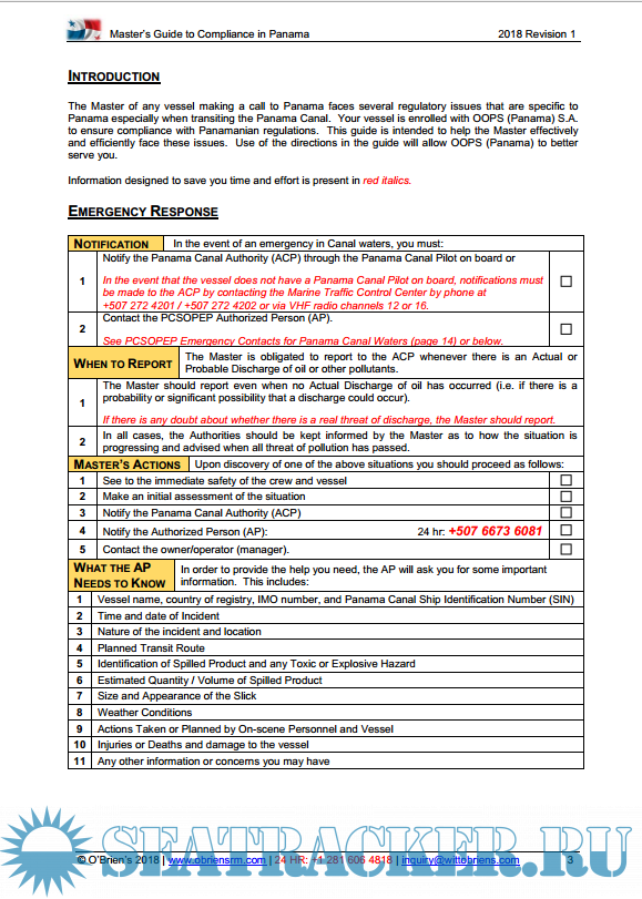 Description: This is a practical guide for Masters to assist in compliance with Panamanian laws and regulations. It is not an “official” document and is not required for compliance. It is intended to provide useful direction for Masters. It does not replace any document required by law or regulation. It does not replace direction provided by the ship’s owner/manager/operator. This guide may be modified as required to be in harmony with policies of the