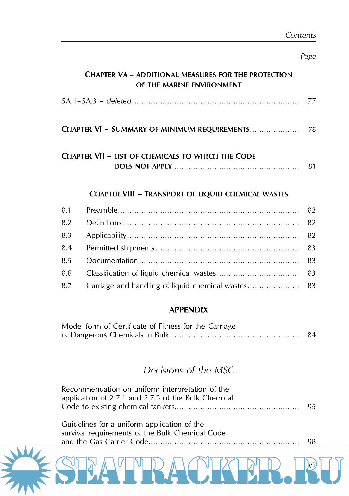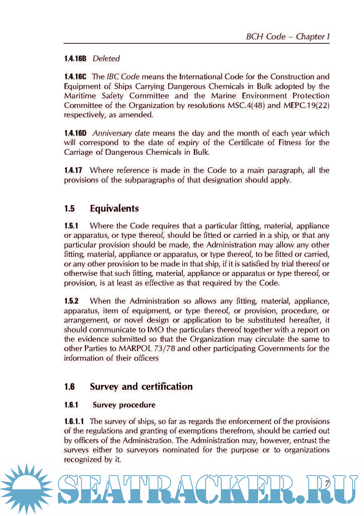 This edition also includes amendments which were adopted by the MEPC by resolution MEPC.41(29) which became effective on 3 February 2000; by resolution MEPC.56(33) which became effective on 1 July 1994; by resolu- tion MEPC.70(38) which became effective on 1 July 1998; by resolution MEPC.80(43) which became effective on 1 July 2002 and by resolution MEPC.91(45) which also became effective on 1 July 2002. Chapters VI and VII of the BCH Code are now much shorter than in earlier editions because they refer the user to chapters 17 and 18 of the IBC Code.