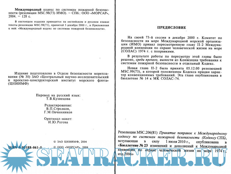 Описание: Международный кодекс по системам пожарной безопасности (резолюция MSC.98(73) ИМО). - СПб.: ООО «МОРСАР», 2004. - 128 с.