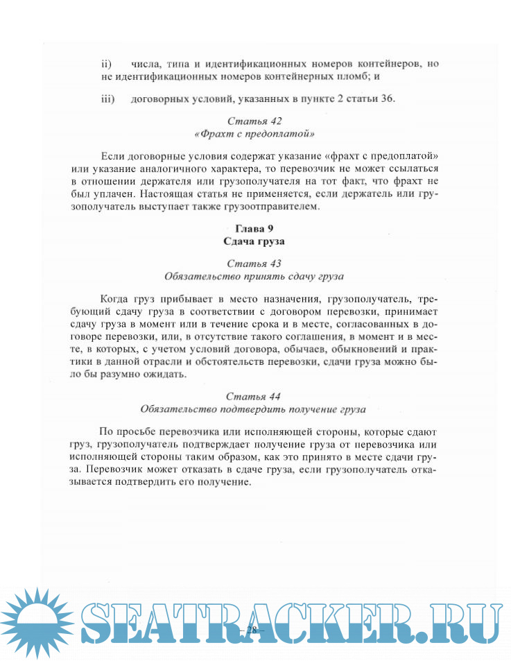 Общие положения Определения Толкование настоящей Конвенции Требования в отношении формы Применимость возражений и пределов ответственности Сфера применения Конкретные исключения Применение в отношении определенных сторон Транспортные электронные записи Обязательства перевозчика Ответственность перевозчика за утрату, повреждение или задержку в сдаче груза Дополнительные положения, касающиеся конкретных стадий перевозки Отклонение от курса Палубный груз на судах Обязательства грузоотправителя перед перевозчиком Транспортные документы и транспортные электронные записи Сдача груза Права контролирующей стороны Передача прав Пределы ответственности Срок для предъявления иска Юрисдикция Арбитраж Действительность договорных положений Вопросы, не регулируемые настоящей Конвенцией Заключительные положения