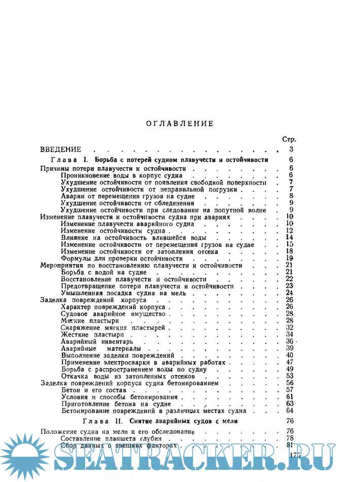 В книге описываются причины и характер морских аварий, порядок действий и способы их ликвидации собственными силами экипажей судов. В ней рассматриваются судовые средства для аварийных работ и подробно описываются способы ликвидации аварий при поступлении воды внутрь корпуса судна (потеря плавучести и остойчивости), посадка судна на мель и потеря хода. Также описываются способы оказания взаимопомощи транспортными и промысловыми судами и кратко даны сведения, которые необходимы для ведения совместных аварийно-спасательных работ.