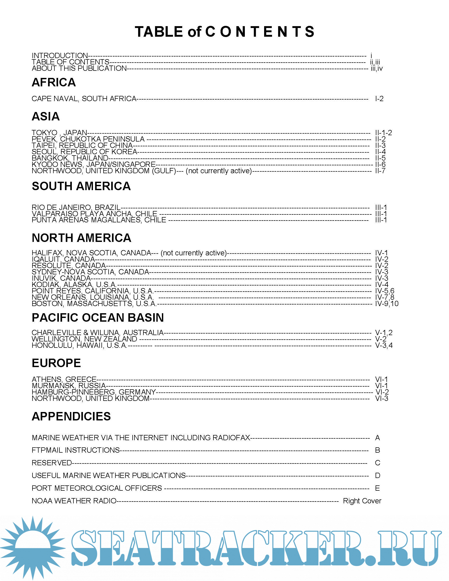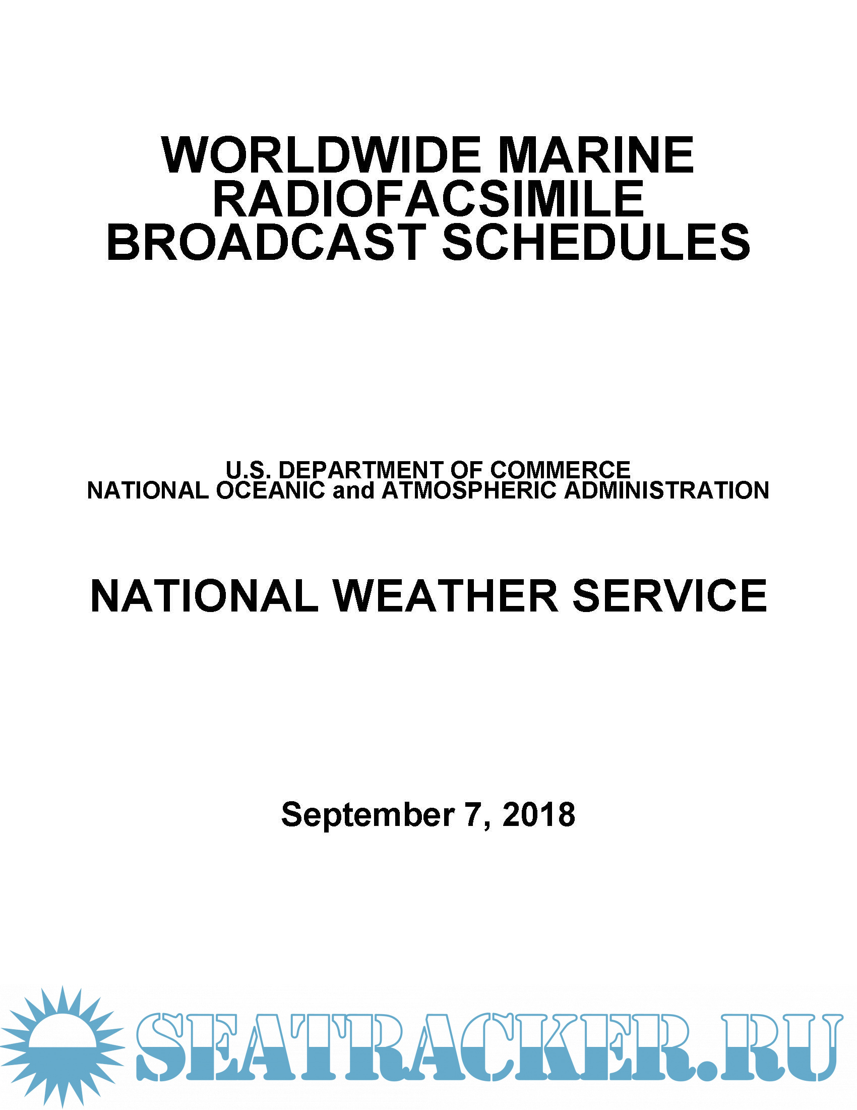 Year: 2018 Language: english Author: NOAA Genre: Documentation Format: PDF Quality: eBook Pages count: 132 Description: The schedules contained in this publication were obtained from official and unofficial sources. The information herein may neither be complete or accurate. Wherever possible, the schedules are dated with the latest change available. The National Weather Service would like to thank everyone who provided assistance. For ease of use, all stations are listed by WMO region, in alphabetical order, by country and location. All times listed herein are Universal Coordinated Time (UTC), unless otherwise indicated. Unless otherwise stated, assigned frequencies are shown, for carrier frequency subtract 1.9 kHz. Typically dedicated radiofax receivers use assigned frequencies, while receivers or transceivers, connected to external recorders or PC's, are operated in the upper sideband (USB) mode using carrier frequencies. For information on weather broadcasts worldwide, also refer to NGA Publication 117, the Canadian Coast Guard Radio Aids to Navigation (Canada Only) and the British Admiralty List of Signals, which are updated through Notices to Mariners. Information on these and other marine weather publications may be found in Appendix D. These publications are HIGHLY recommended. This document also includes information on how to obtain National Weather Service text forecasts, graphic forecasts, and marine observations via the Internet and e-mail (FTPMAIL). Mariners are highly encouraged to explore these options.