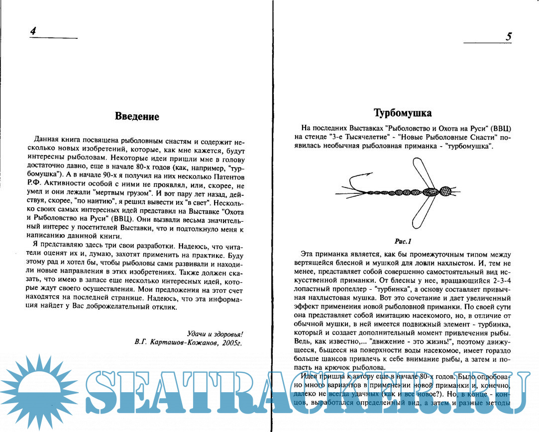 Описание: Данная книга посвящена рыболовным снастям и содержит несколько новых изобретений, которые, видимо, будут интересны рыболовам. В книге представлены три разработки В.Г.Карташова-Кожанова - турбомушка, балансирный поплавок и спиральная блесна. Мы надеемся, что читатели оценят их и, возможно, захотят применить на практике. Автор был бы рад этому и хотел бы, чтобы рыболовы сами развивали и находили новые направления в этих изобретениях.