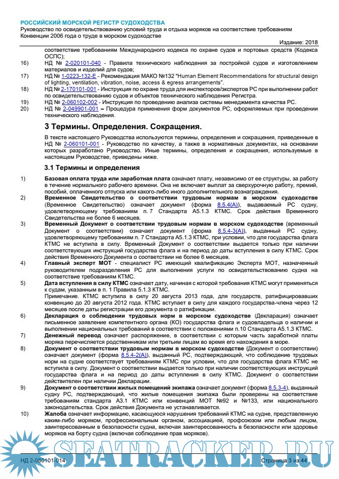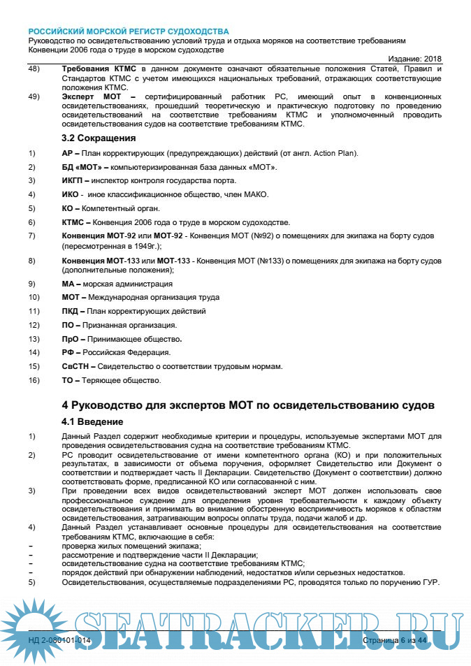 Настоящее руководство определяет порядок проведения работ по установлению соответствия условий труда и отдыха моряков на судах требованиям Конвенции 2006 года о труде в морском судоходстве с учетом национального законодательства.