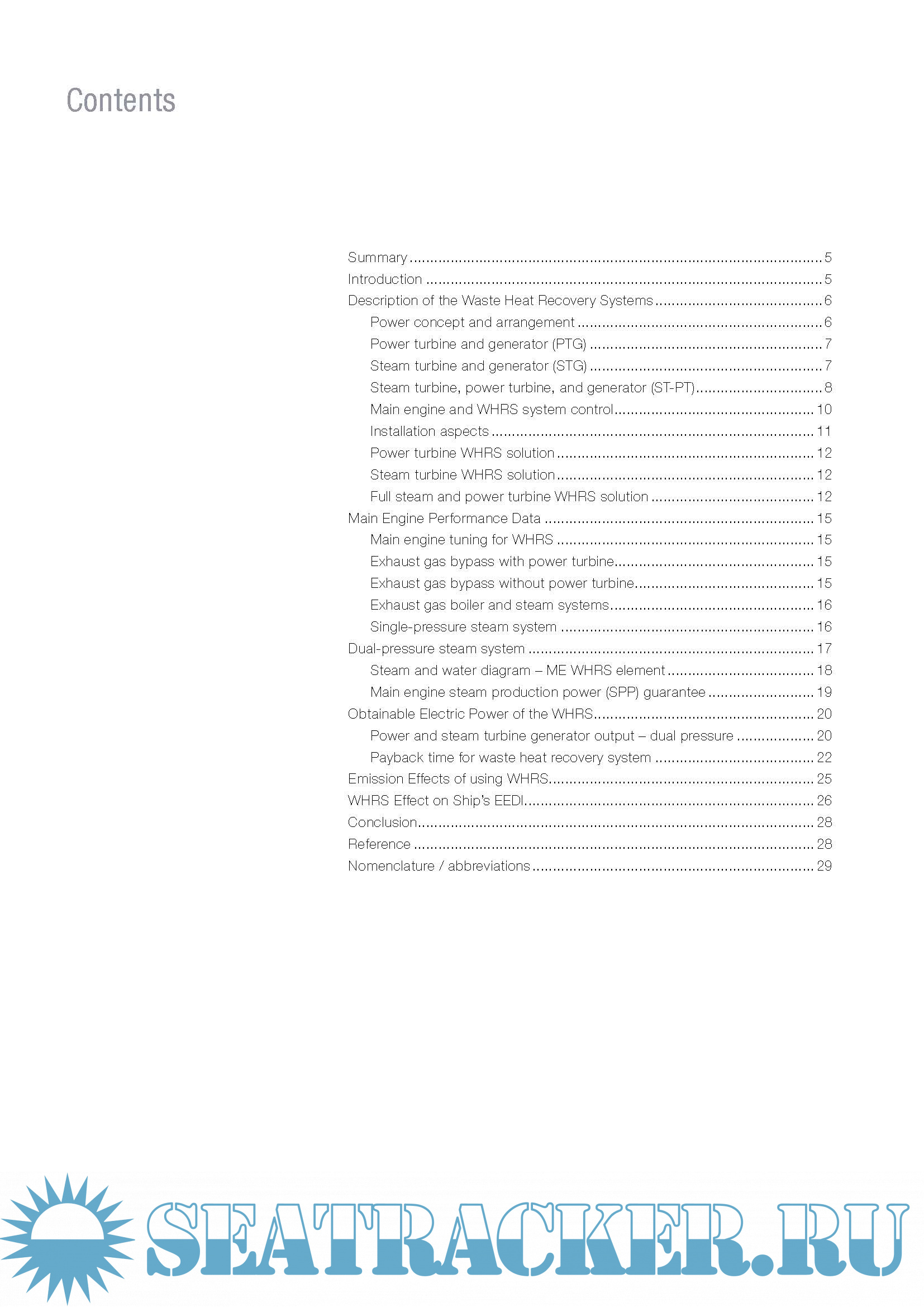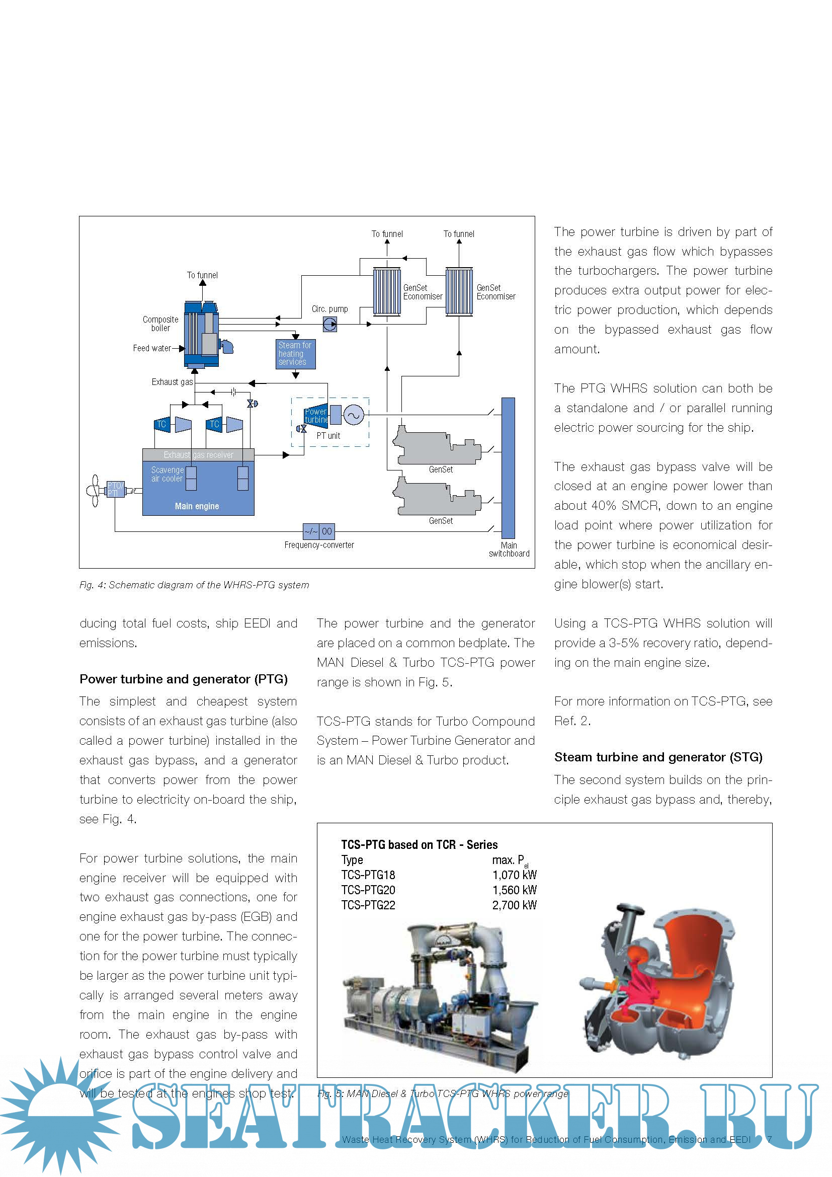Year: 2014 Language: english Author: MAN Diesel & Turbo Genre: Technical book Format: PDF Quality: eBook Pages count: 32 Description: The increasing interest in emission reduction, ship operating costs reduction and the newly adapted IMO EEDI rules calls for measures that ensure optimal utilisation of the fuel used for main engines on board ships. Main engine exhaust gas energy is by far the most attractive among the waste heat sources of a ship because of the heat flow and temperature. It is possible to generate an electrical output of up to 11% of the main engine power by utilising this exhaust gas energy in a waste heat recovery system comprising both steam and power turbines, and combined with utilising scavenge air energy for exhaust boiler feed-water heating.