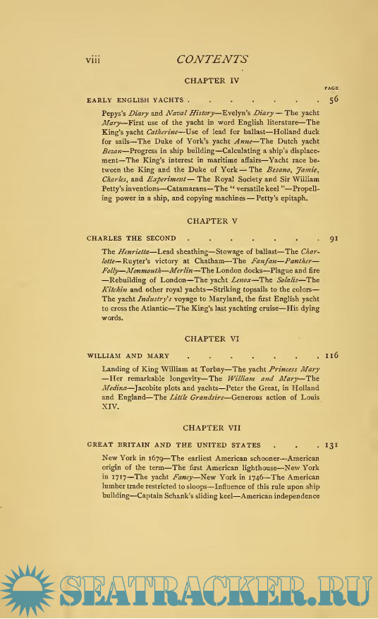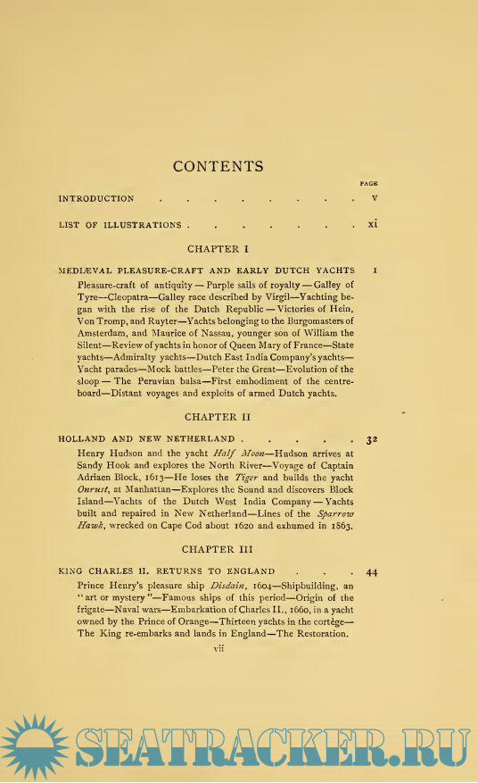 At first sight it seems singular that no history of the origin and early development of yachts and yachting has ever been written. A little reflection, however, will convince one of the amount of labor necessarily involved in such an undertaking. And had I been able to foresee the difficulties before me, it is doubtful whether this task would have been begun. But once undertaken, it became most interesting; and as the libraries, museums, and old print-shops of Holland, Great Britain, and the United States, little by little, yielded their treasures, forming links here and there — with many fathoms of space between — it became a matter of unbounded pleasure to discover these old links — rusty though they were — and forge them into a chain as complete as historical chains usually are.