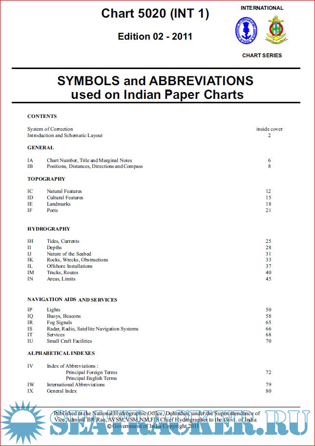 Description: This publication provides reference to the many symbols and abbreviations used on Indian and International paper charts.