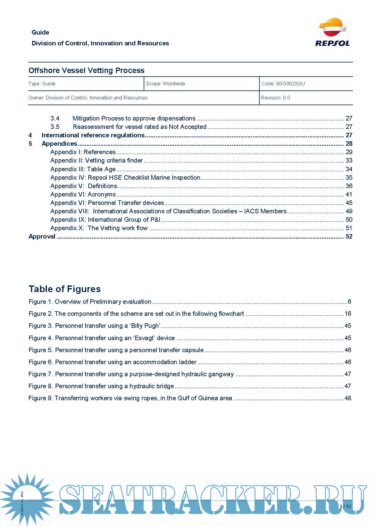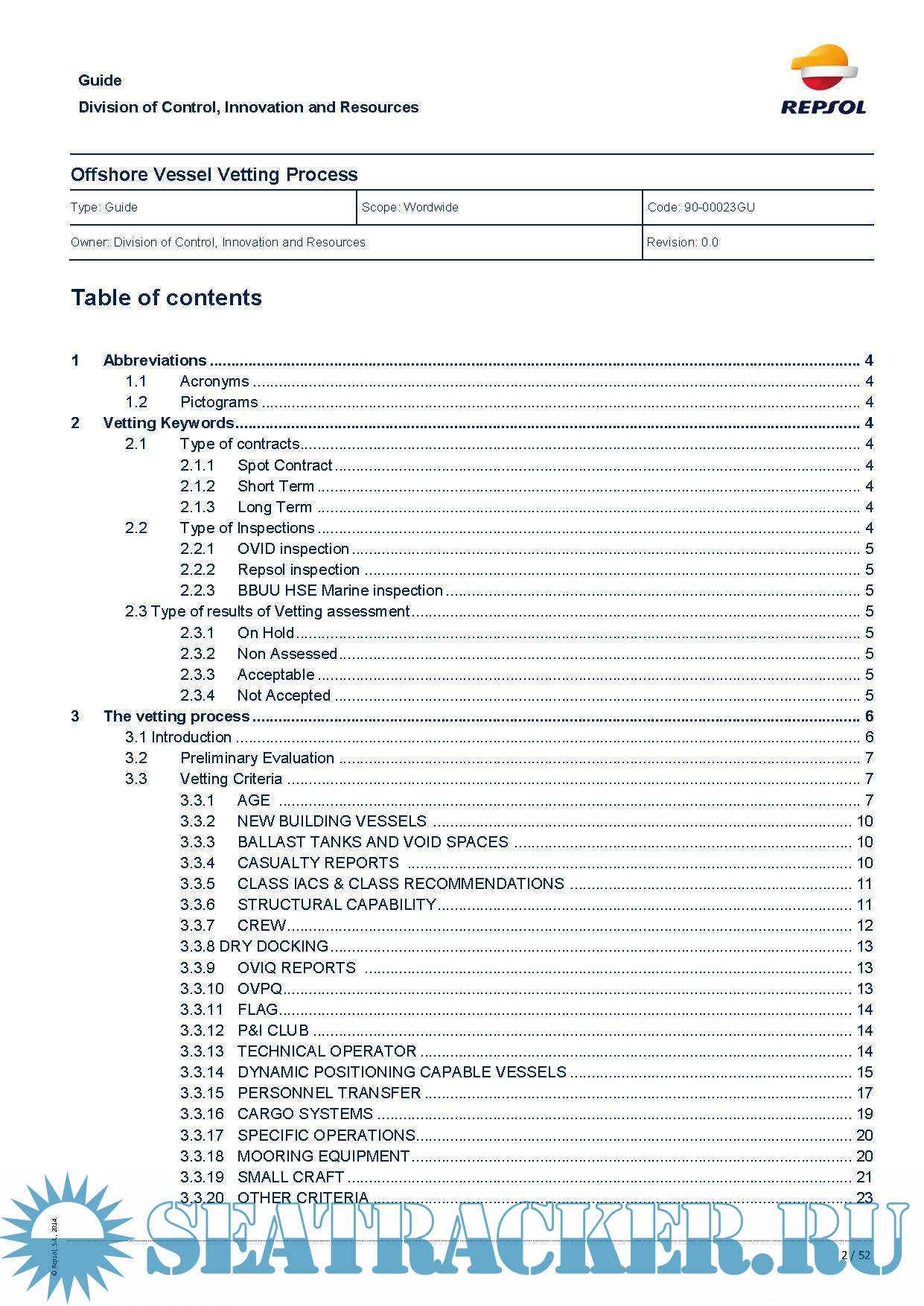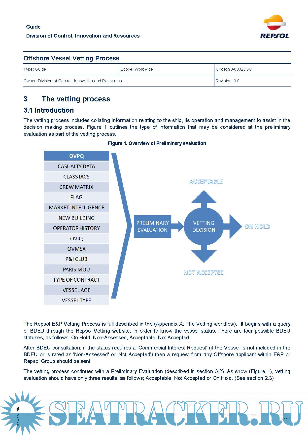 Year: 2014 Language: english Author: REPSOL Genre: Reference book Format: PDF Quality: eBook Pages count: 52 Description: The Repsol E&P Vetting Process begins with a query of BDEU through the Repsol Vetting website, in order to know the vessel status. There are four possible BDEU statuses, as follows: On Hold, Non-Assessed, Acceptable, Not Accepted. After BDEU consultation, if the status requires a 'Commercial Interest Request' (if the Vessel is not included in the BDEU or is rated as 'Non-Assessed' or ‘Not Accepted’) then a request from any Offshore applicant within E&P or Repsol Group should be sent. The vetting process continues with a Preliminary Evaluation . Vetting evaluation should have only three results, as follows; Acceptable, Not Accepted or On Hold.