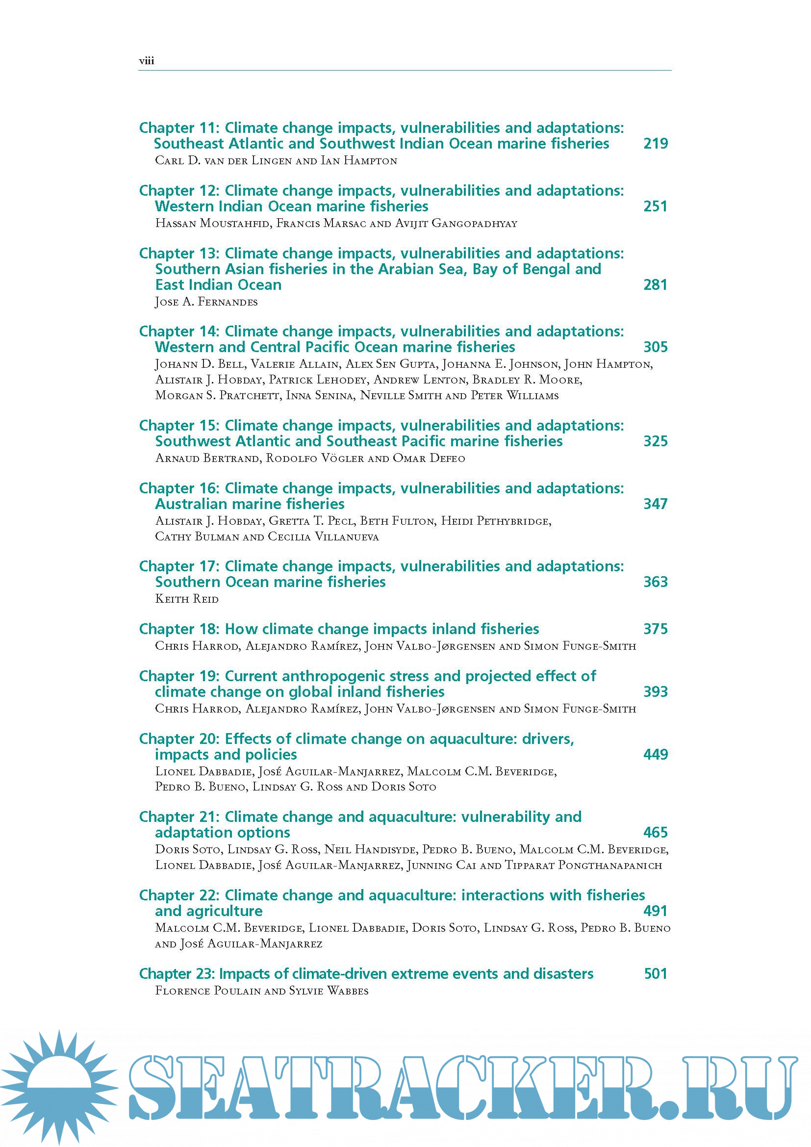 Year: 2018 Language: english Author: FOOD AND AGRICULTURE ORGANIZATION OF THE UNITED NATIONS Genre: Technical book Format: PDF Quality: eBook Pages count: 654 Description: The 2015 Paris Climate Agreement recognizes the need for effective and progressive responses to the urgent threat of climate change, through mitigation and adaptation measures, while taking into account the particular vulnerabilities of food production systems. The inclusion of adaptation measures in the fisheries and aquaculture sector is currently hampered by a widespread lack of targeted analyses of the sector’s vulnerabilities to climate change and associated risks, as well as the opportunities and responses available. This report provides the most up-to-date information on the disaggregated impacts of climate change for marine and inland fisheries, and aquaculture, in the context of poverty alleviation and the differential dependency of countries on fish and fishery resources. The work is based on model projections, data analyses, as well as national, regional and basin-scale expert assessments. The results indicate that climate change will lead to significant changes in the availability and trade of fish products, with potentially important geopolitical and economic consequences, especially for those countries most dependent on the sector.