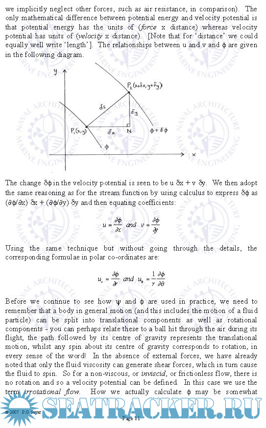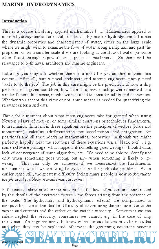 Description: This is a course involving applied mathematics!!....... Mathematics applied to marine hydrodynamics for naval architects. By marine hydrodynamics I mean the dynamic properties and characteristics of water, either on the large scale where we might wish to examine the flow of water along a ship hull and past the propeller, or on a smaller scale if we are looking at the flow of water (or some other fluid) through pipework or a piece of machinery. So there will be relevance to both naval architects and marine engineers.