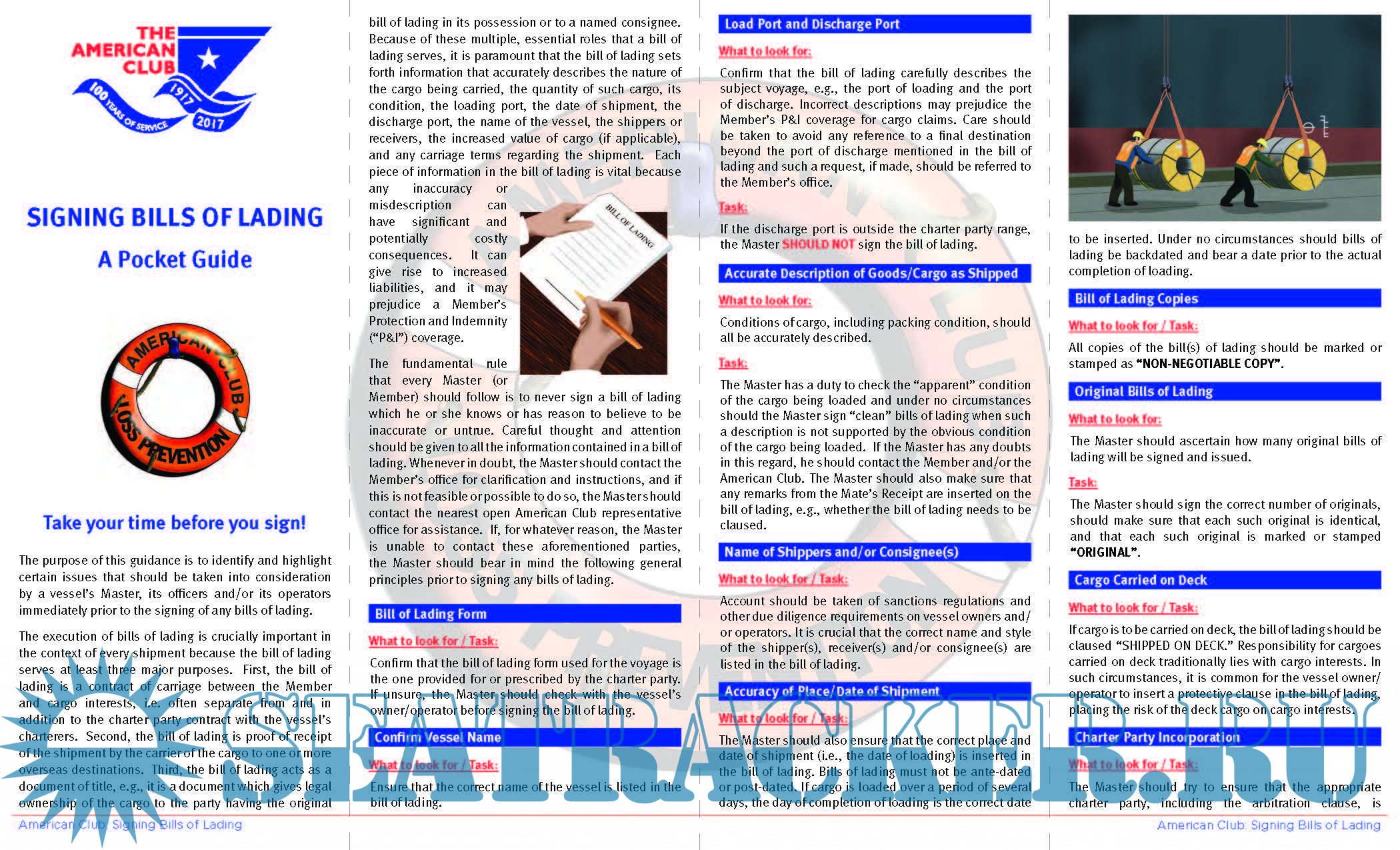 Description: This download contains the 2 pages pocket guide of the American P & I Club regarding signing the Bills of Ladings