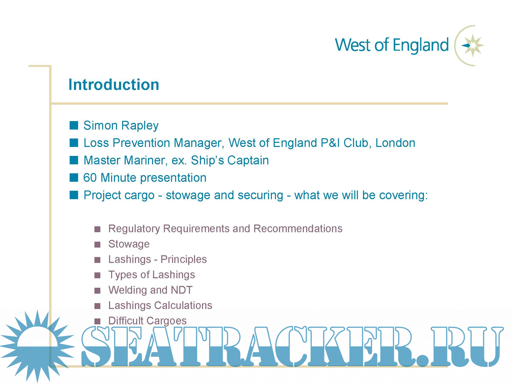 Description: This presentation covers the Project cargo -stowage and securing from the aspects of Regulatory Requirements and Recommendations, Stowage, Lashings -Principles, Types of Lashings, Welding and NDT, Lashings Calculations, Difficult Cargoes.