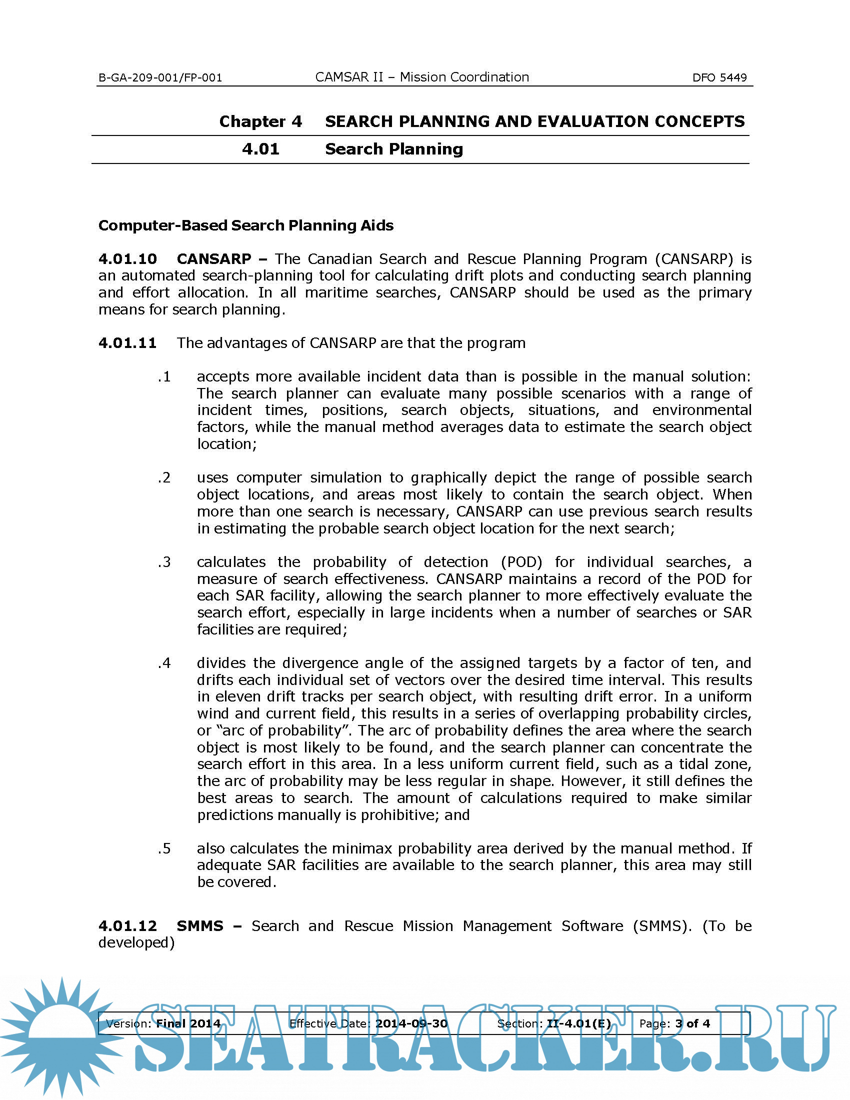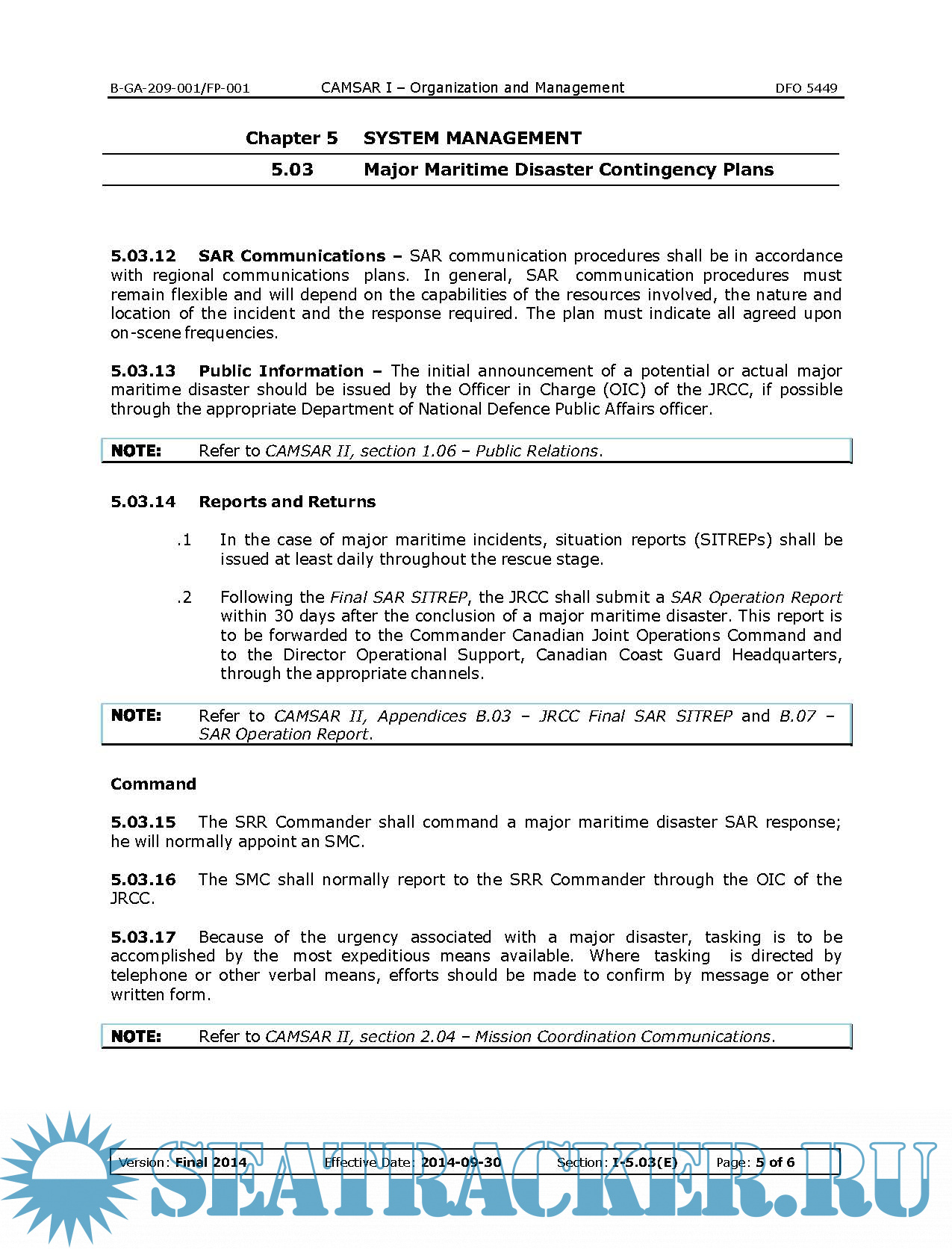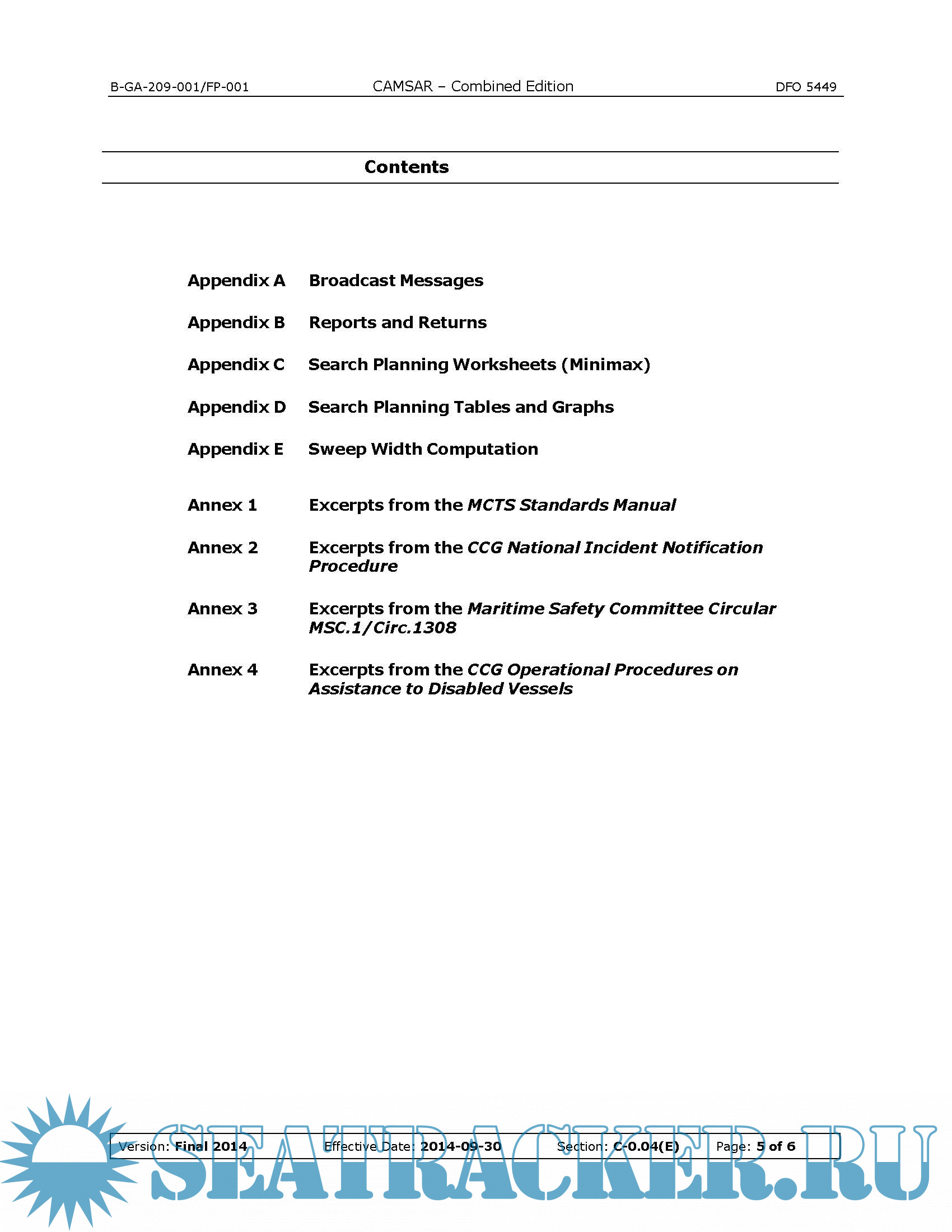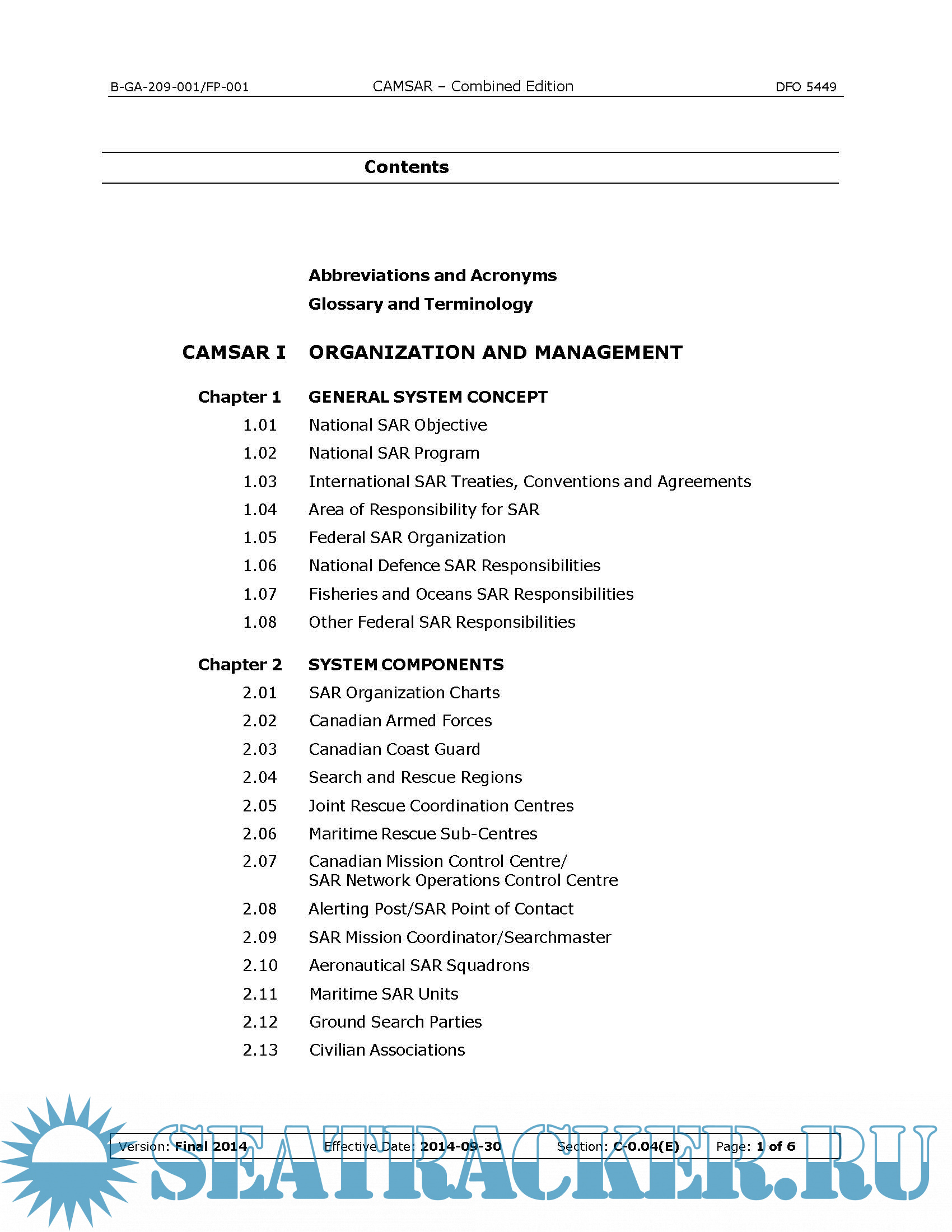 Description: The purpose of the Canadian Aeronautical and Maritime Search and Rescue (CAMSAR) Manual is to supplement the International Aeronautical and Maritime Search and Rescue (IAMSAR) Manual by providing national guidelines and standard operating procedures (SOPs) specific to the Canadian Federal Aeronautical and Maritime Search and Rescue (SAR) System. In turn, the CAMSAR Manual is meant to be augmented by regional and local SOPs.