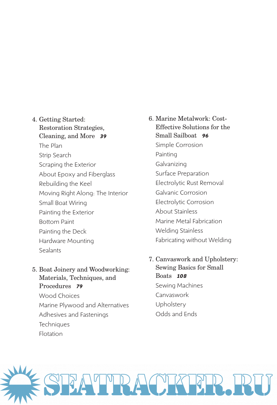 Gilbert's clear, step-by-step instructions guide you through every phase of the restoration process from repairing keels, hulls, ports, and cabins to painting, wiring, and sealing. You'll learn how to evaluate, repair and replace hardware, upholstery, canvaswork, and more. Profusely illustrated appendices give you a vivid picture of the costs, tasks, and labor involved in an actual restoration project.