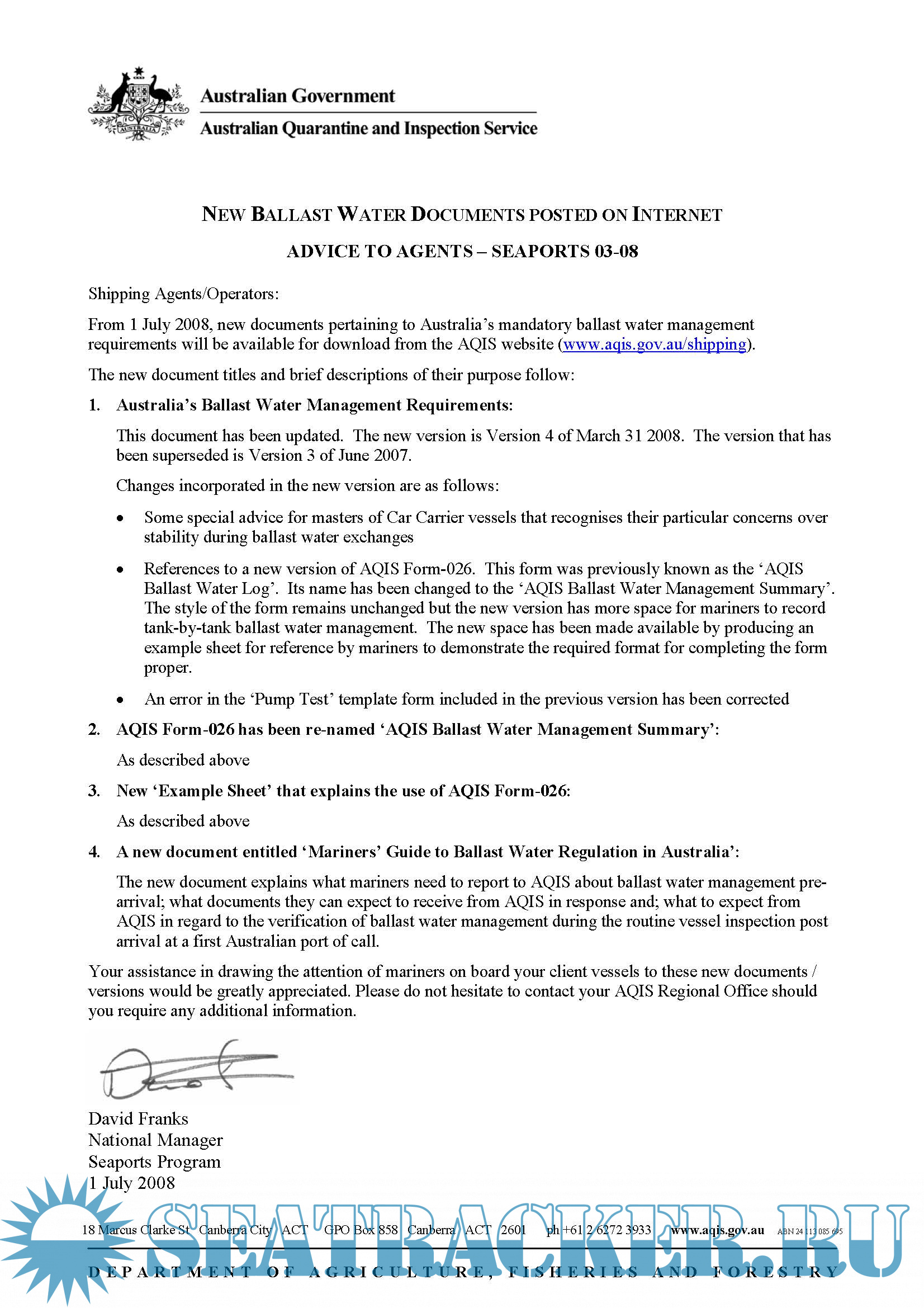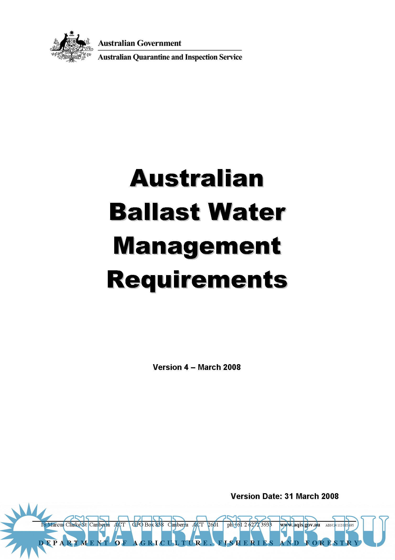 1. Shipping Industry Advice Notice No. 03-2008 with Australian Ballast Water Management Requirements Version 4, AQIS (2008) - pages 222. Australian Ballast Water Management Requirements Version 7, Department of Agriculture and Water Resources, (2017) - 34 Pages