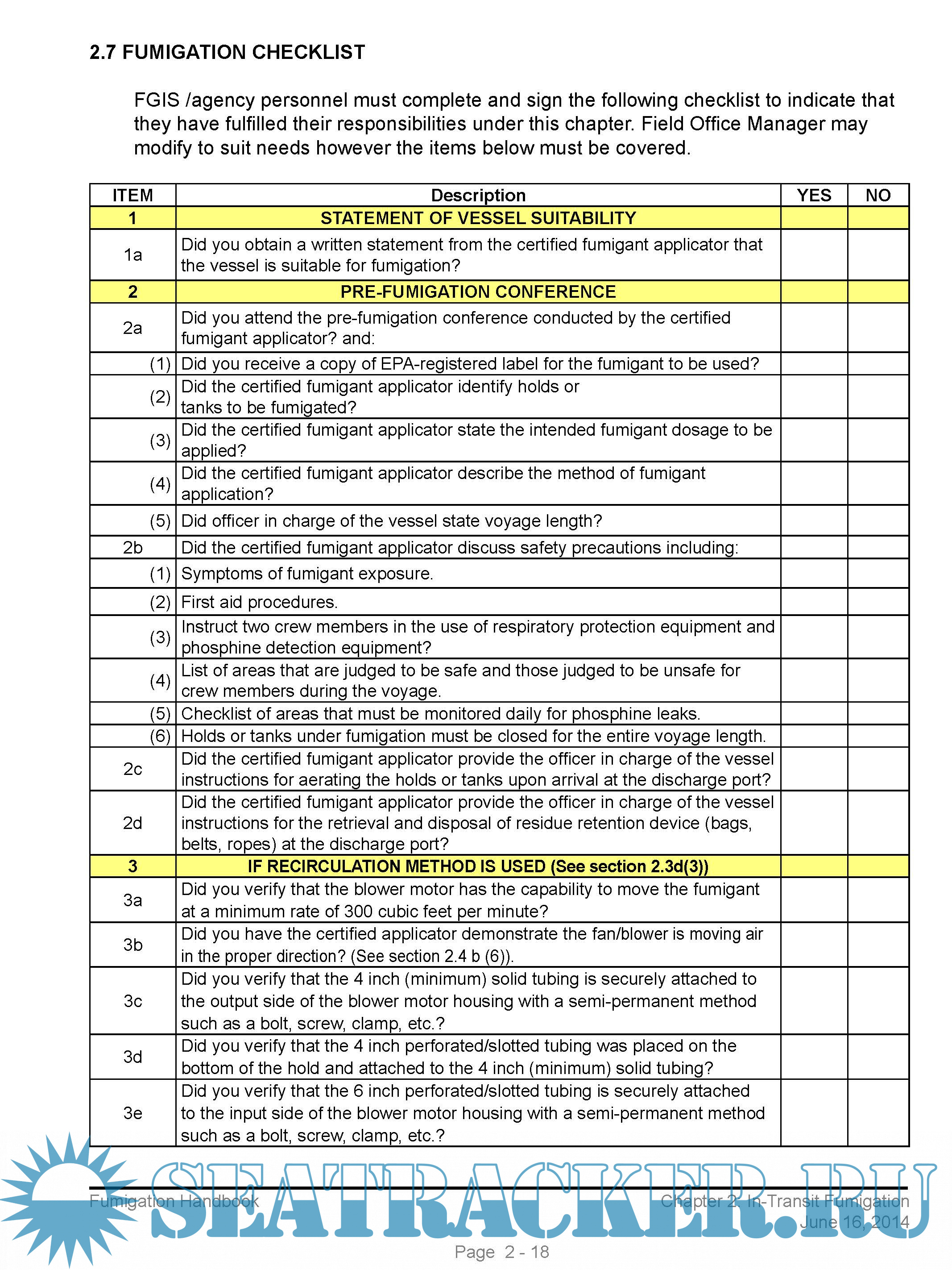 The handbook provides official inspection personnel with basic information regarding fumigants and fumigation procedures. The procedures in this handbook supersede “Fumigation Handbook”, dated September, 1987; Fumigation Handbook, Chapter 3, Land Carrier Fumigation, dated 2/27/90; Fumigation Handbook, Chapter 4, River Barge Fumigation, dated 10/28/93; FGIS-PN-97-14, “Fumigant Label Retention,” dated 5/16/97; FGIS-PN-04-11, “In-transit Fumigation of Shipholds with Separations,” dated 4/19/04; and FGIS-PN-05-02, “Short Voyage Ship Fumigation Procedures,” dated 1/07/05.