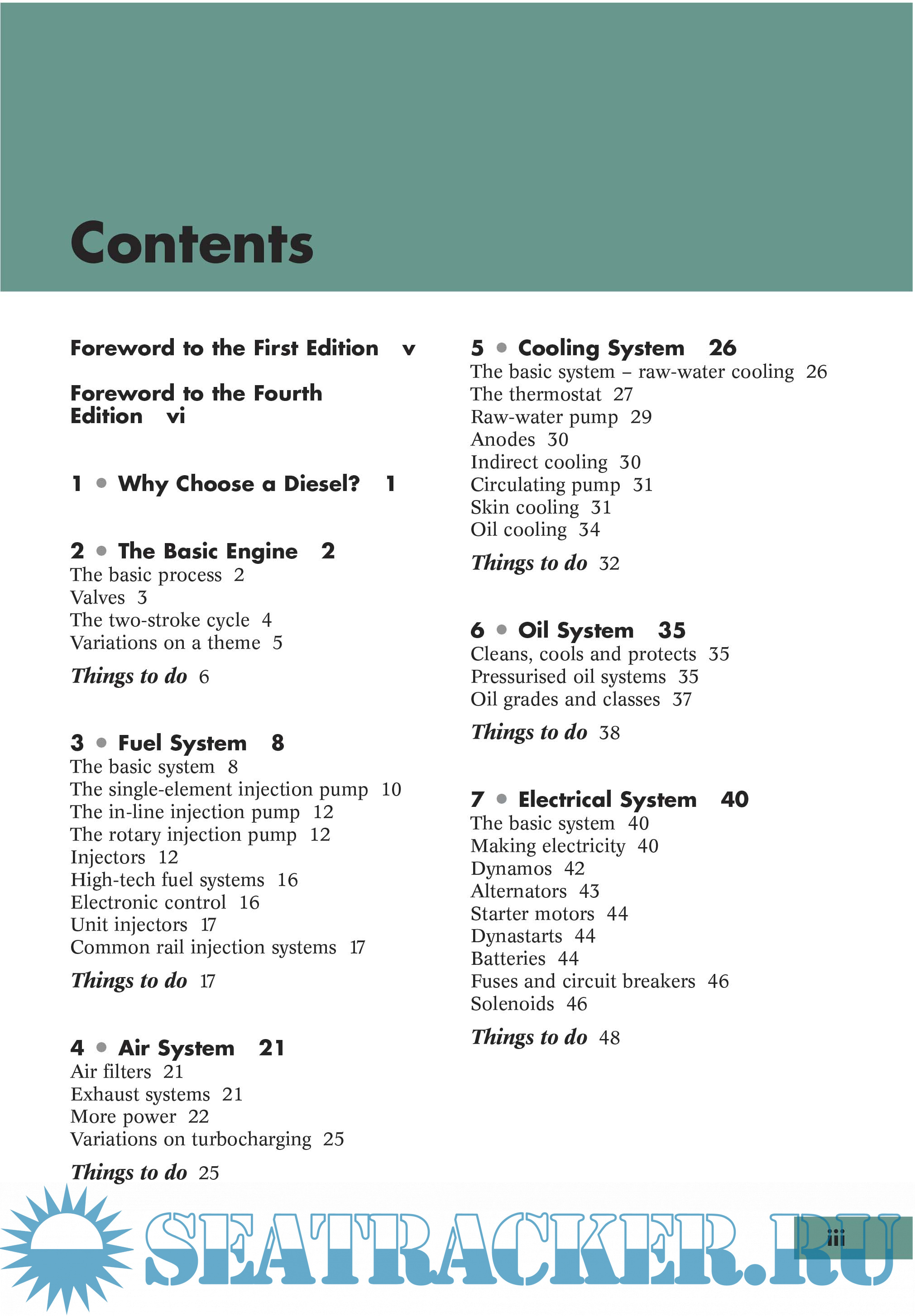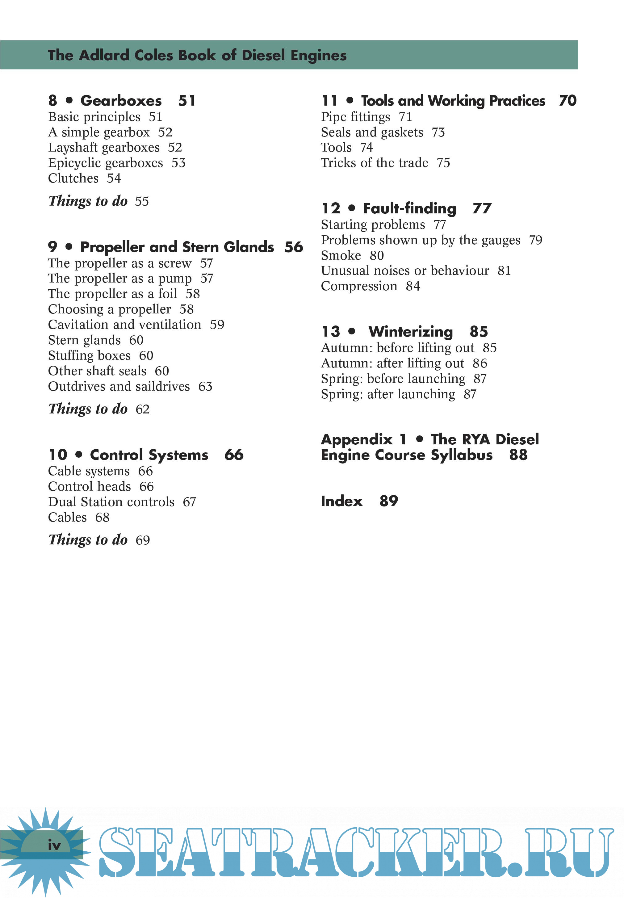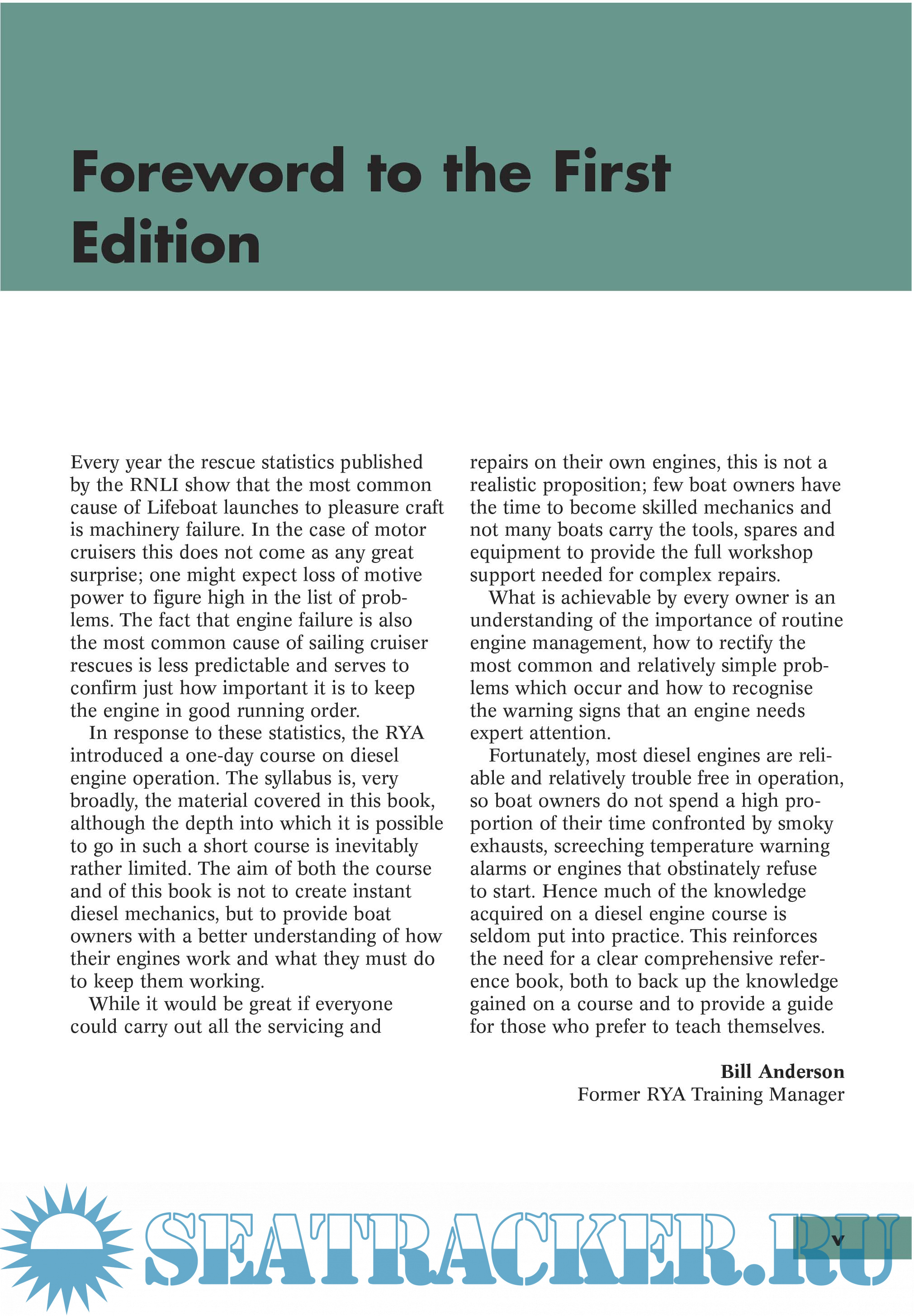 Year: 2011 Language: english Author: Tim Bartlett Genre: Handbook Publisher: Adlard Coles Nautical Edition: 4th ISBN: 978-1-4081-4635-4 Format: PDF Quality: eBook Pages count: 97 Description: The Adlard Coles Book of Diesel Engines is aimed at boatowners rather than experienced mechanics. In clear, jargon-free English it explains how a diesel engine works, and how to look after it, and takes into account developments in engine technology. This fourth edition has been thoroughly updated and illustrated with new full-colour photos and diagrams. Tim Bartlett explains how the engine uses simple processes to covert fuel to power, and then looks at the various sub-systems that allow those processes to take place. He also advises on tools, winterizing and provides hints, tips and helpful fault-finding tables. Systems covered include: fuel, air, cooling, oil, electrical, propeller and transmission and control. Additional info: Some pages contain errors ( pictures are represented abnormally - pp 10,22,30,41,54,56, may be some else) :( PS See my other releases in the "Yachting, sailing, boating" topic: https://seatracker.xyz/tracker.p...id=54420#results