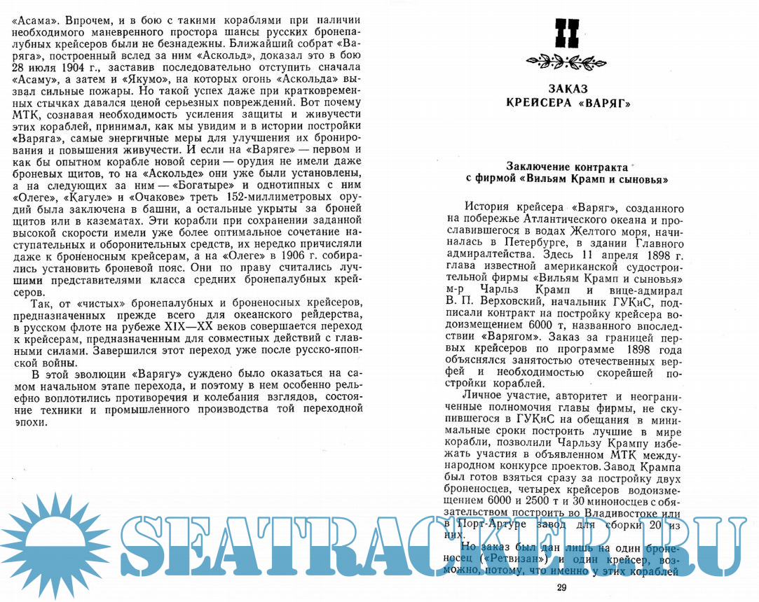 Год выпуска: 1975 Язык: русский Автор: Мельников Р. М. Жанр: История Издательство: Судостроение Формат: PDF Качество: Отсканированные страницы Количество страниц: 271 Описание: В книге на основе многочисленных неопубликованных архивных материалов в хронологической последовательности описывается драматическая история знаменитого русского крейсера "Варяг", начиная от его заказа в Америке и кончая последними днями существования. В книге рассказывается о неизвестных обстоятельствах боя у Чемульпо, приводятся новые примеры доблести и героизма русских моряков, называются забытые имена. Особое внимание технической стороне истории "Варяга",то есть истории самого корабля как инженерного сооружения, всегда являющегося отражением научно-технического уровня и общественно-политического строя своей эпохи.