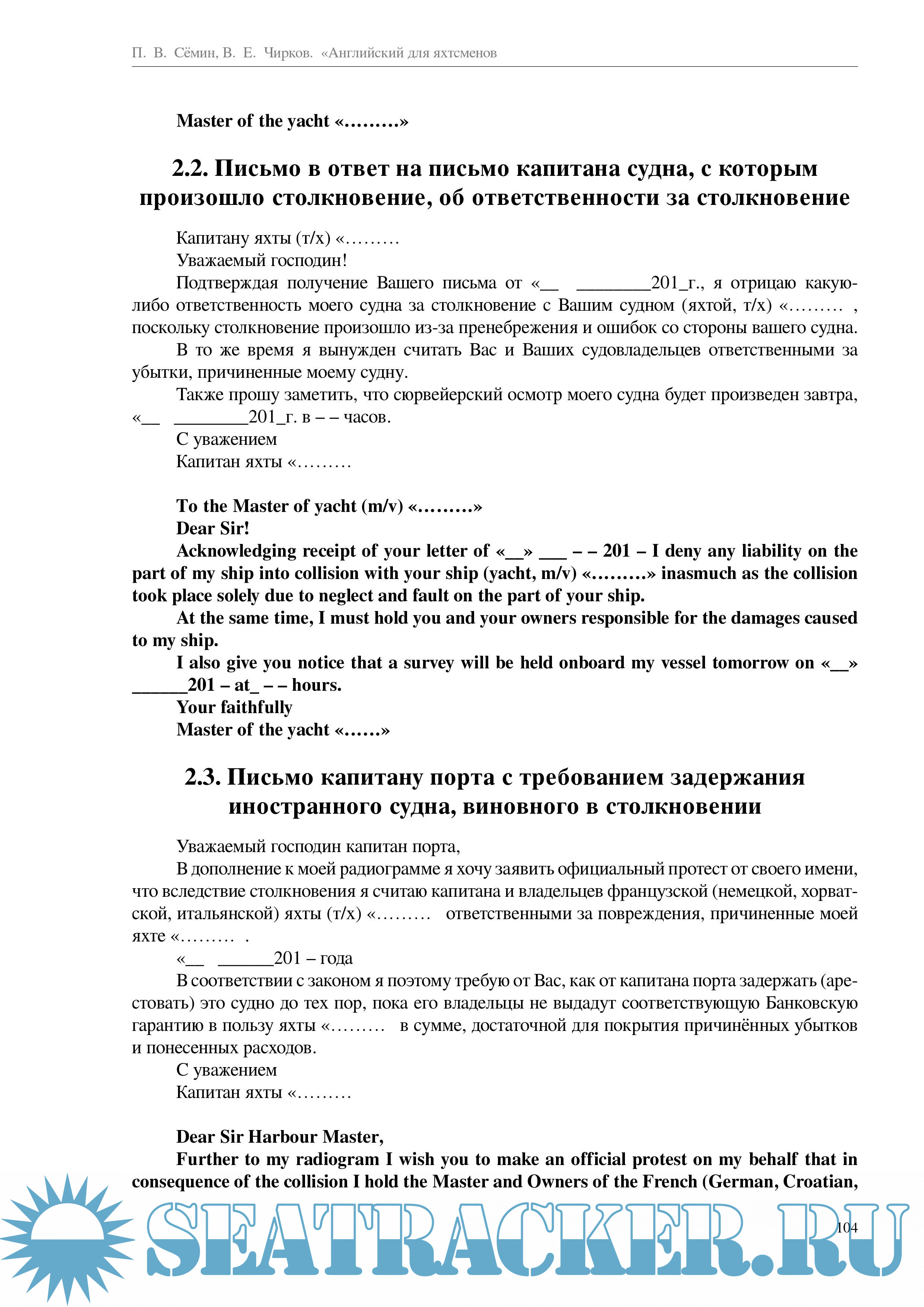 2.2. Письмо в ответ на письмо капитана судна, с которым произошло столкновение, об ответственности за столкновение 104