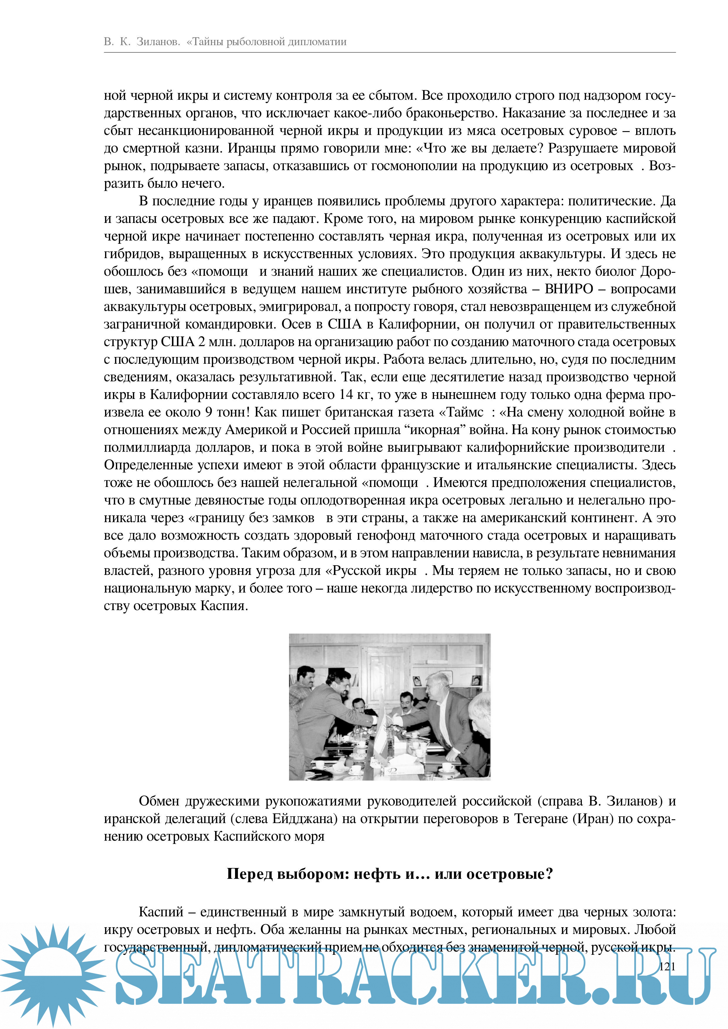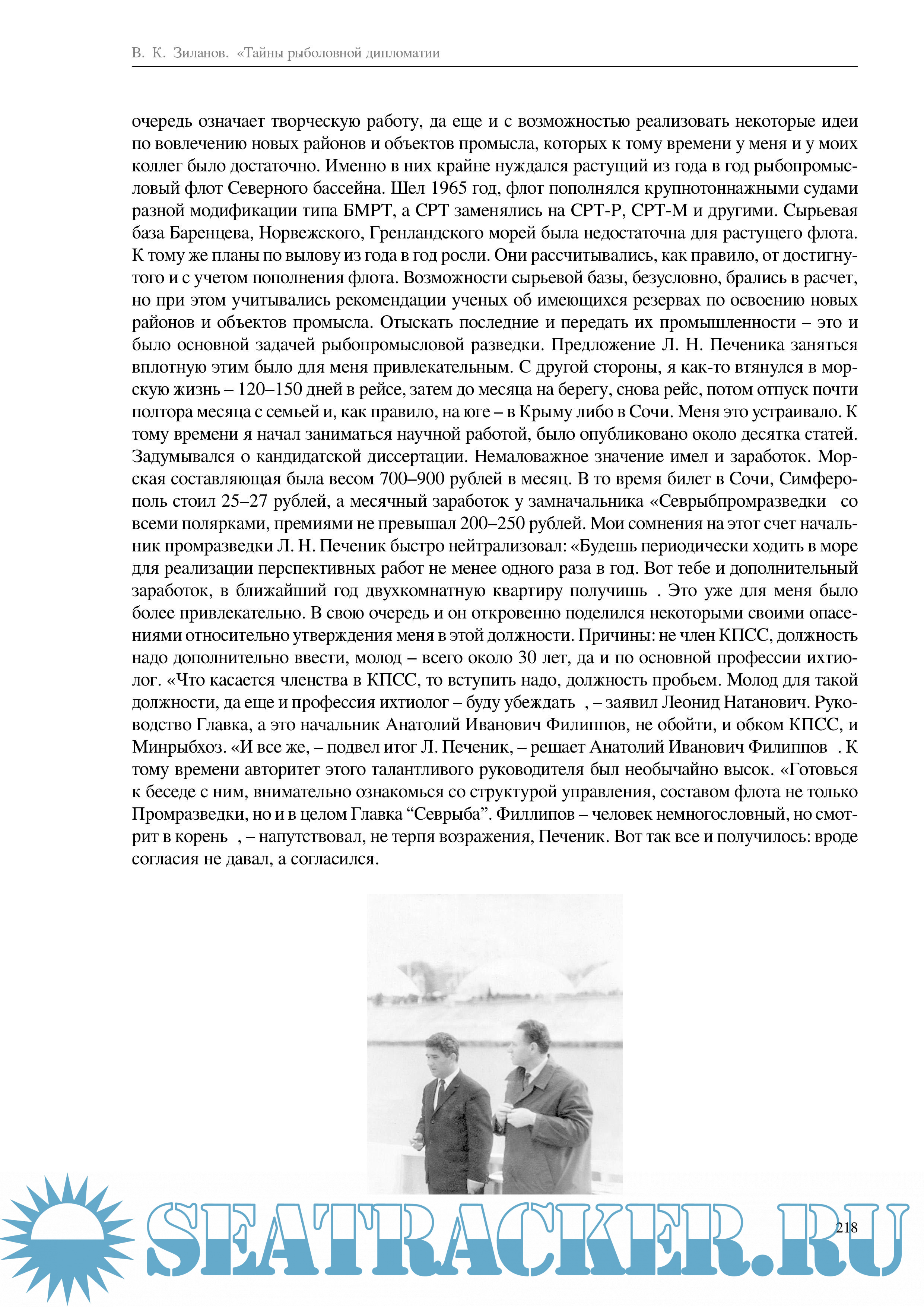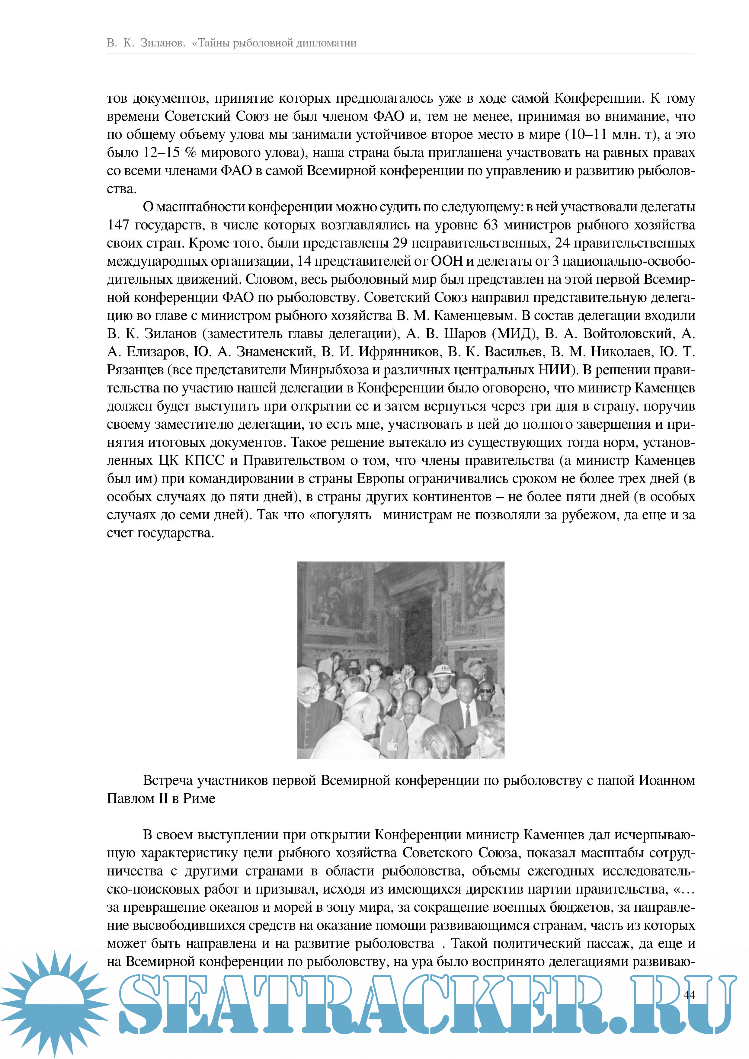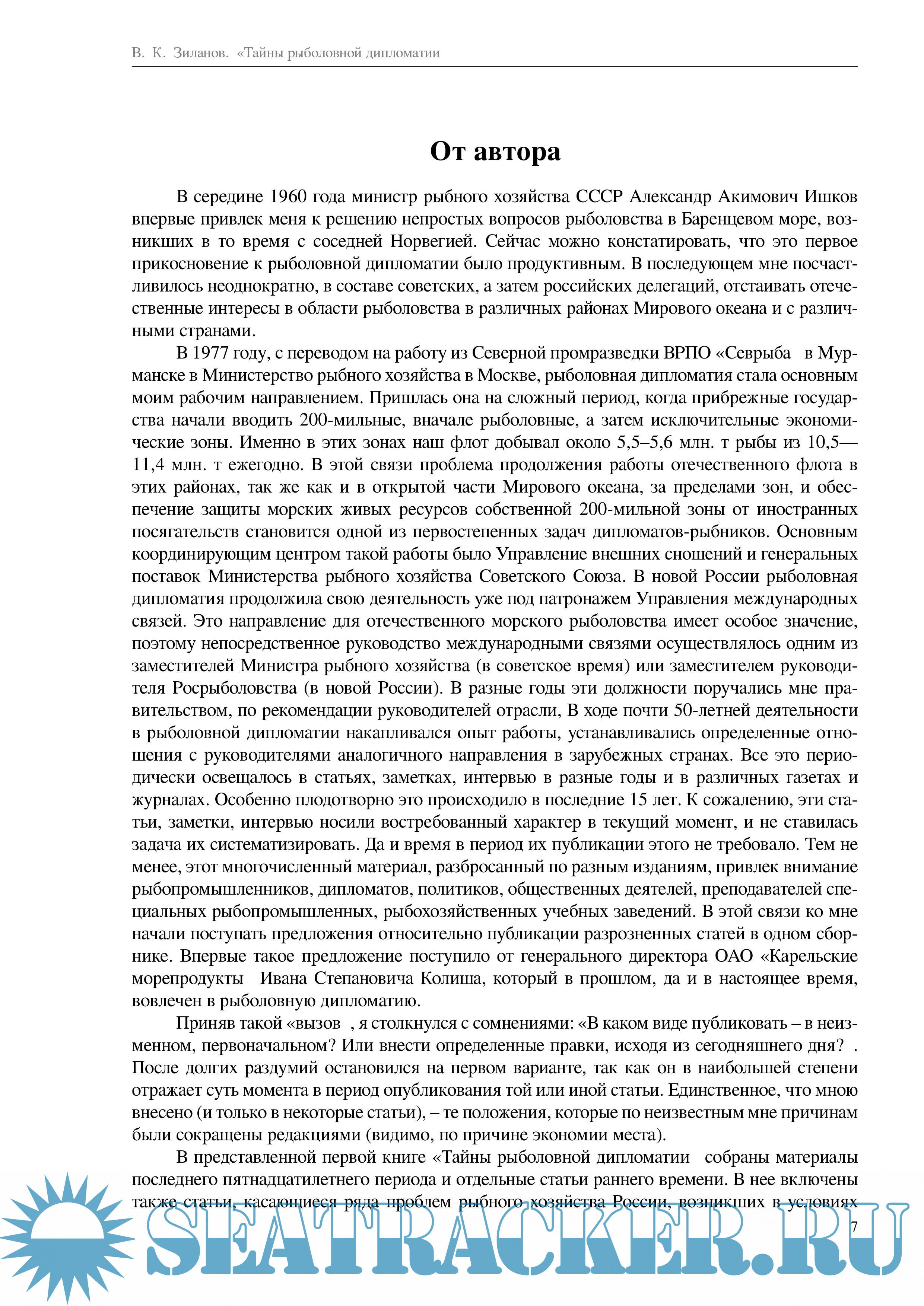 В последующем В.К. Зиланову посчастливилось неоднократно, в составе советских, а затем российских делегаций, отстаивать отечественные интересы в области рыболовства в различных районах Мирового океана и с различными странами. В ходе почти 50-летней деятельности в рыболовной дипломатии накапливался опыт работы, устанавливались определенные отношения с руководителями аналогичного направления в зарубежных странах. Все это изложено в новой книге В.К. Зиланова.