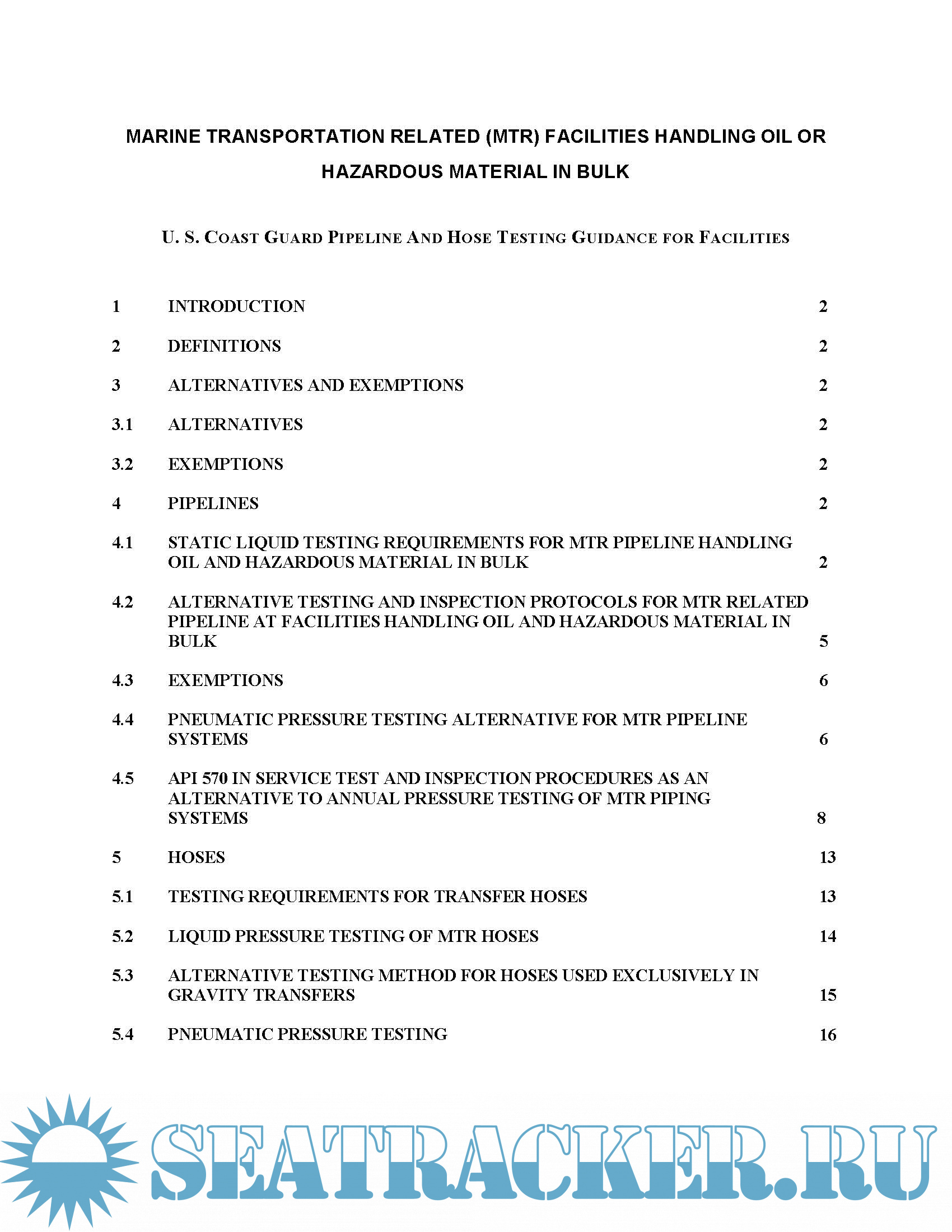 Year: 2017 Language: english Author: USCG Genre: Guide Format: PDF Quality: eBook Pages count: 20 Description: This circular replaces the guidance contained in Reference (a) and provides expanded information concerning pipeline and hose testing guidance at facilities that are capable of transferring oil or hazardous materials in bulk, to or from a vessel. This guidance is consistent with existing regulations, and it provides expanded information and recommendations for the Captain of the Port (COTP) and Officer in Charge, Marine Inspection (OCMI) to consider when evaluating the acceptability of proposed alternative test methods for jurisdictional facility pipe and hose tests and inspections