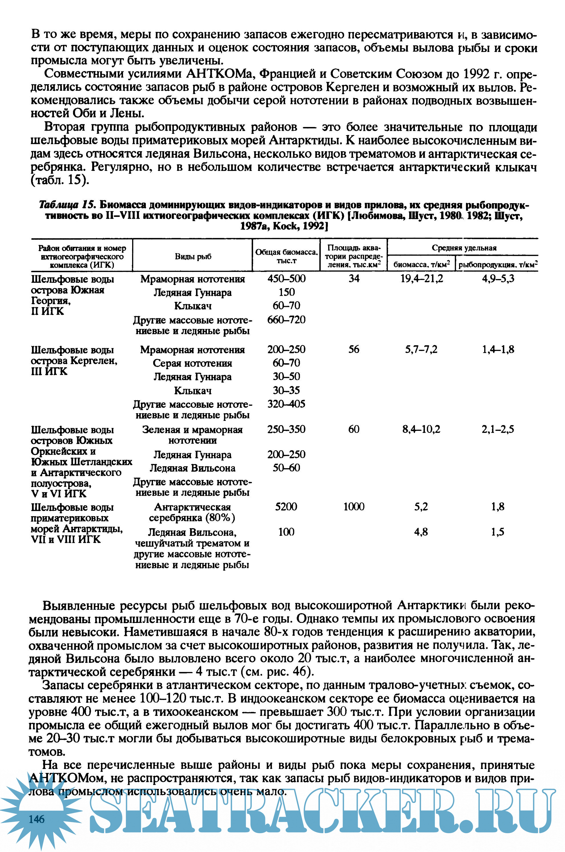 На базе сравнительного анализа результатов научно-исследовательских экспедиций и статистики промысла даны характеристики современного состояния популяций промысловых видов рыб и оценка перспектив использования рыбных ресурсов Антарктики.