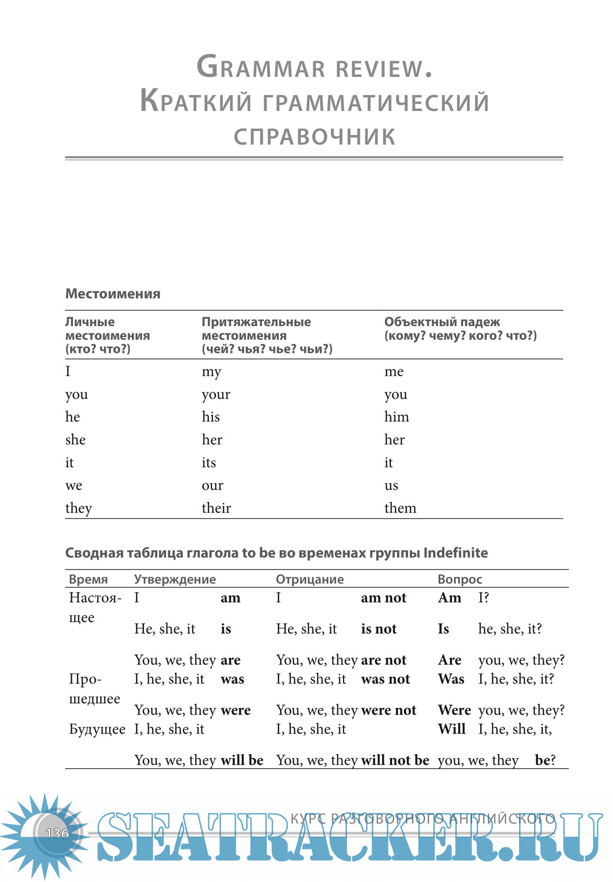 К читателям. То be or not to be? Самый важный глагол в английском языке. What are you doing at the moment? Чем вы занимаетесь в данный момент?. What do you do? Чем вы занимаетесь?. What are you plans for tomorrow? Какие у вас планы на завтра?. What did you do yesterday? Что вы делали вчера?. Have you already done it? Вы уже сделали это?. Summary. Порядок слов в предложениях. What's happened? Вопрос к подлежащему. Have you got.? Глагол to have и оборот have got. Оборот to have to. Is there.? Мы выясняем, есть ли то, что нам нужно, и где это находится. What would you like? Глаголы to need, to want, оборот would like. What can we do for you? Что мы можем сделать для вас?. What should we do? Что нам следует делать?. Summary. Особенности модальных глаголов. It must be done. Пассивные конструкции. То do or not to do? Простой инфинитив. I know nothing. Отрицание в английском предложении. I know it. Местоимение it. Something and somebody. Употребление местоимений some, any и их производных. Prepositions. Английские предлоги. Phrasal verbs. Фразовые глаголы. Right choice of words. Правильный выбор слов. Существительные, прилагательные и наречия. Conversational formulas. Формулы общения и общеупотребительные фразы. Список базовых глаголов английского языка. Grammar review. Краткий грамматический справочник.