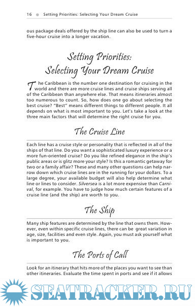 Year: 2003 Language: english Author: Larry H. Ludmer Genre: Guide Format: PDF Quality: Scanned pages + text layer Pages count: 312 Description: This book is intended to serve as an information source for planning a Caribbean cruise, as well as a companion to take with you on land in this beautiful region. It will enable both first-time and experienced travelers to determine the particular cruise that’s right for them and, once the trip has begun, to get the most enjoyment from their time on board and ashore. Experienced travelers rarely get their information from one source, and I wouldn’t expect that you would so limit yourself. Because the port information is geared to the general traveler with only a single day of time available, you should do further research if a particular destination is of special interest to you. Obtaining a guidebook on that place would be of great use. As you peruse this book you’ll learn that a host of cruise lines serve the Caribbean. I encourage everyone to visit their local travel agent and grab a stack of cruise brochures. In combination with the information in this book, they will further help you to decide which ship is right for you. Always remember, however, that glossy brochures are carefully designed to get your business. Be a thoughtful consumer. Enjoy your cruise vacation!