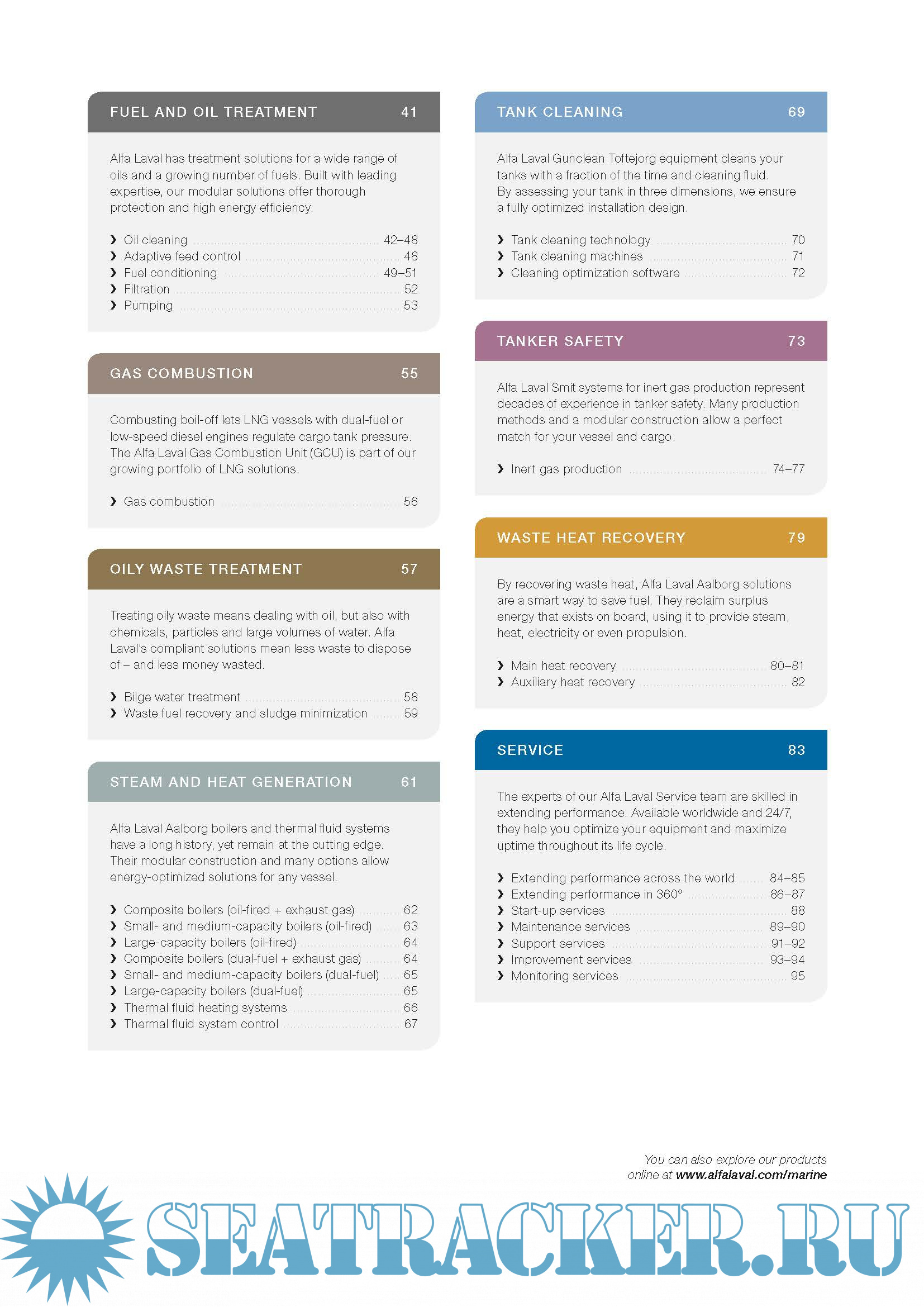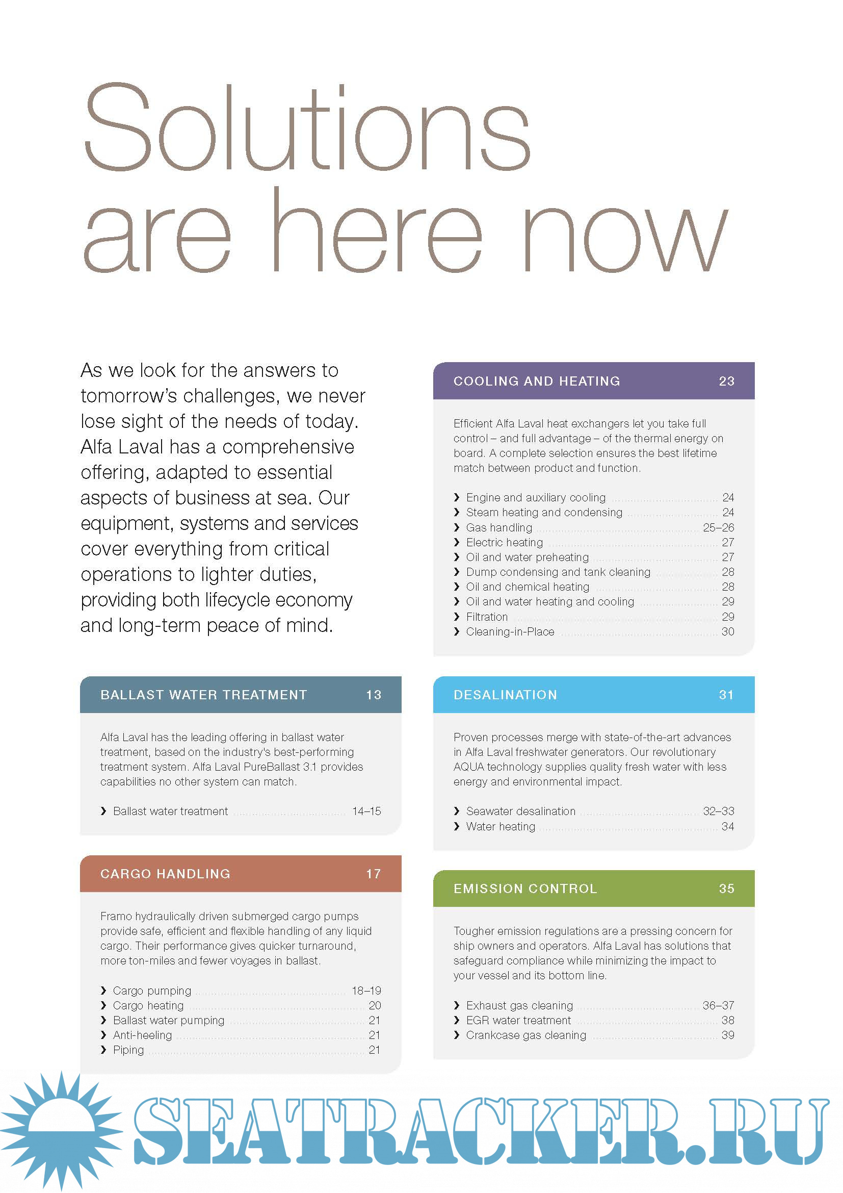 Year: 201x Language: english Author: Alfa Laval Genre: Catalogue Format: PDF Quality: eBook Pages count: 100 Description: As we look for the answers to tomorrow’s challenges, we never lose sight of the needs of today. Alfa Laval has a comprehensive offering, adapted to essential aspects of business at sea. Our equipment, systems and services cover everything from critical operations to lighter duties, providing both life cycle economy and long-term peace of mind.