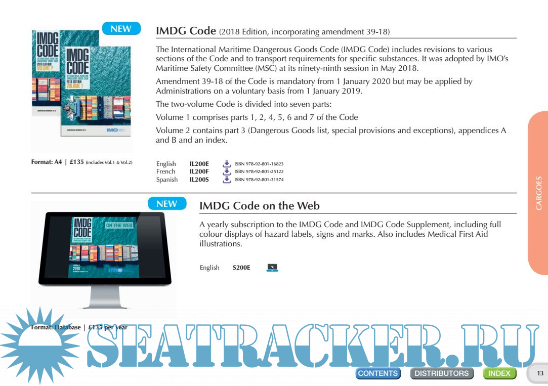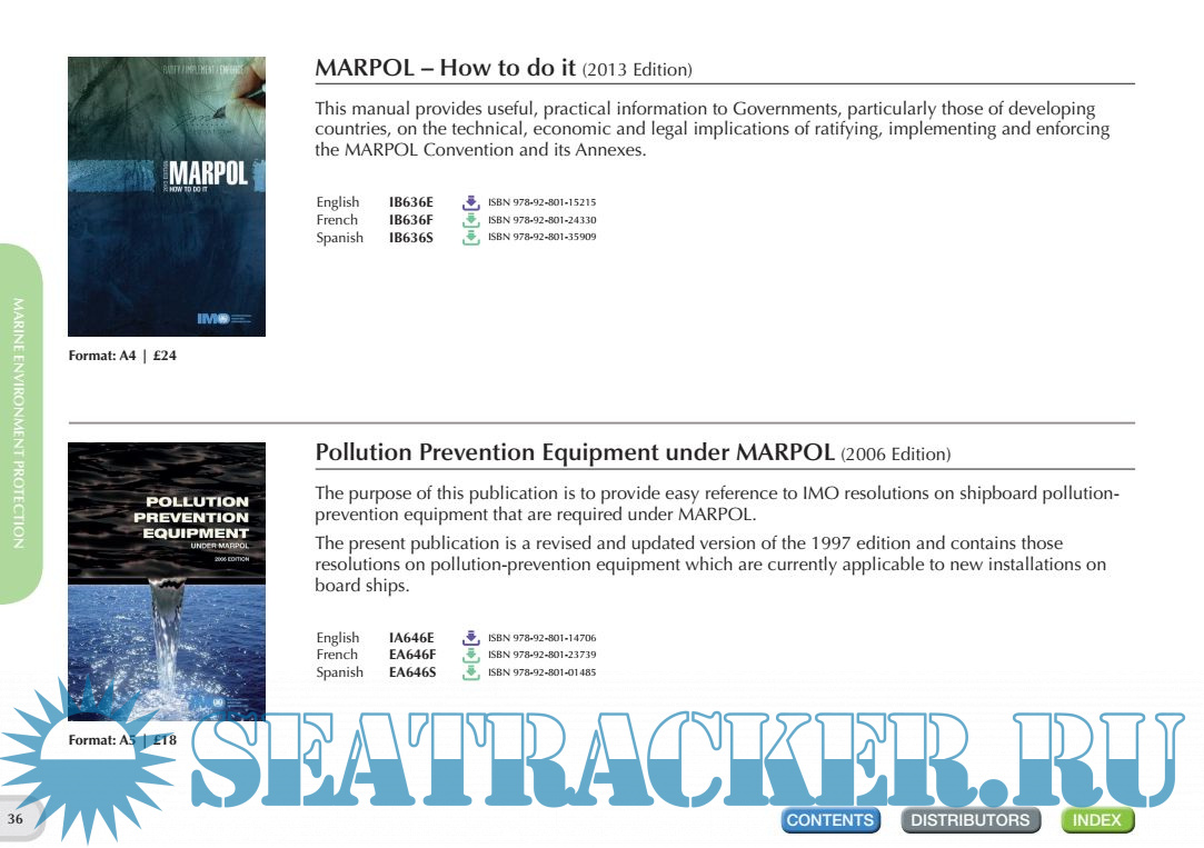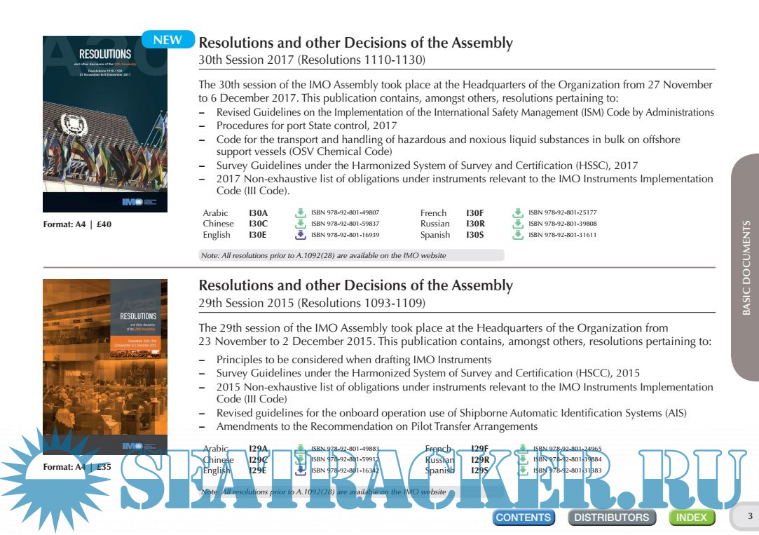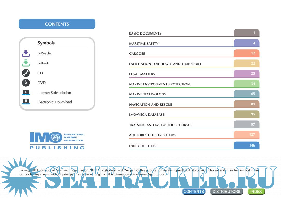 Description: IMO Publishing’s activities provide the world’s maritime community with numerous texts (conventions, codes, regulations, recommendations, guidelines, etc.) prepared by the Organization. There are over 200 titles available in English. Many are translated into Arabic, Chinese, French, Russian and Spanish. IMO Publishing also produces digital products, namely e-books, e-readers, electronic downloads, CDs and internet subscriptions. The dissemination of this information, including attendance at maritime exhibitions worldwide and regular e-newsletters to interested parties, plays an important role in promoting shipping as a safe, secure, efficient and environmentally-friendly method of transporting goods around the globe
