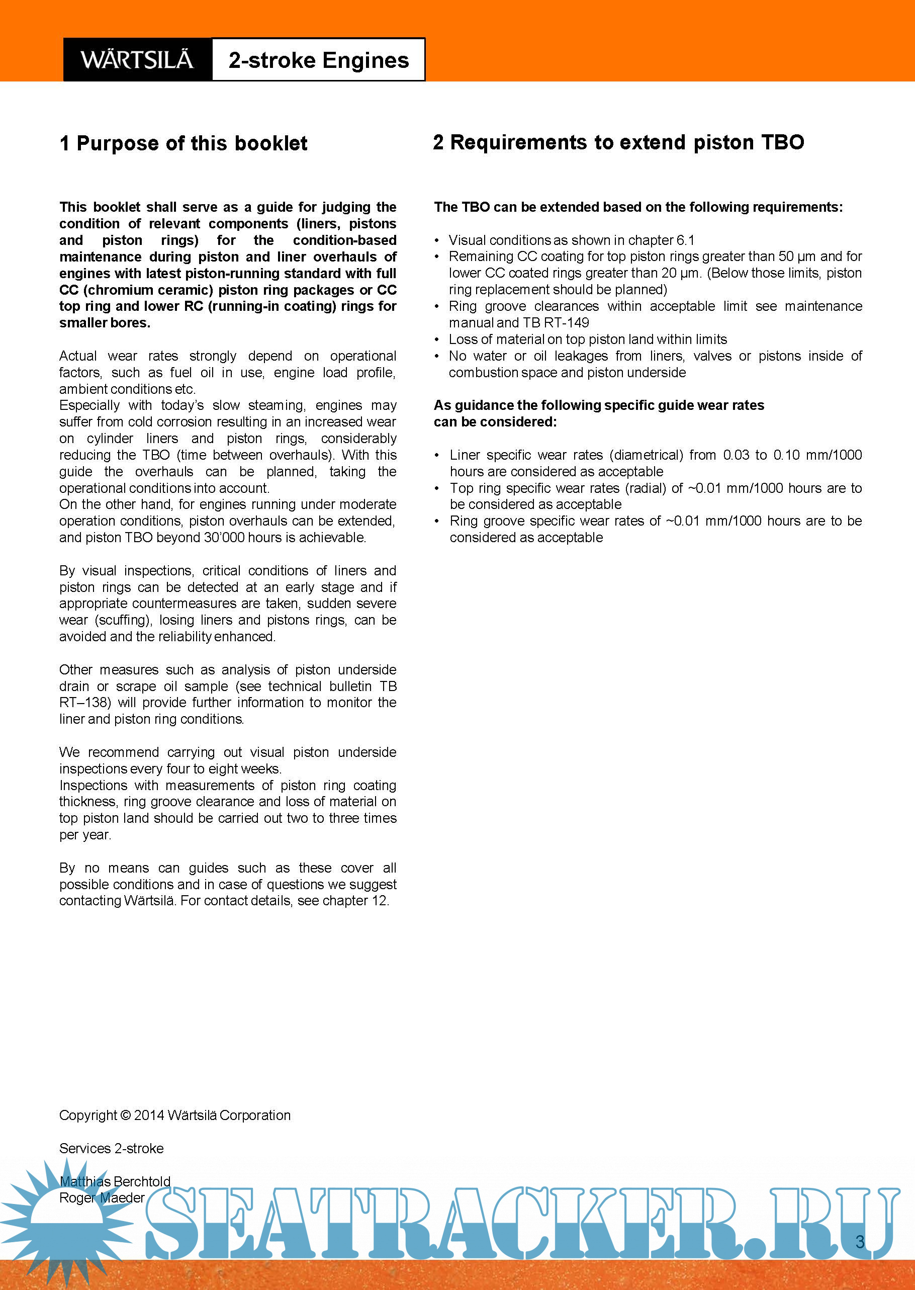 Year: 2014 Language: english Author: Wärtsilä Genre: Guide Format: PDF Quality: eBook Pages count: 32 Description: This booklet shall serve as a guide for judging the condition of relevant components (liners, pistons and piston rings) for the condition-based maintenance during piston and liner overhauls of engines with latest piston-running standard with full CC (chromium ceramic) piston ring packages or CC top ring and lower RC (running-in coating) rings for smaller bores. Actual wear rates strongly depend on operational factors, such as fuel oil in use, engine load profile, ambient conditions etc. Especially with today’s slow steaming, engines may suffer from cold corrosion resulting in an increased wear on cylinder liners and piston rings, considerably reducing the TBO (time between overhauls). With this guide the overhauls can be planned, taking the operational conditions into account. On the other hand, for engines running under moderate operation conditions, piston overhauls can be extended, and piston TBO beyond 30’000 hours is achievable.