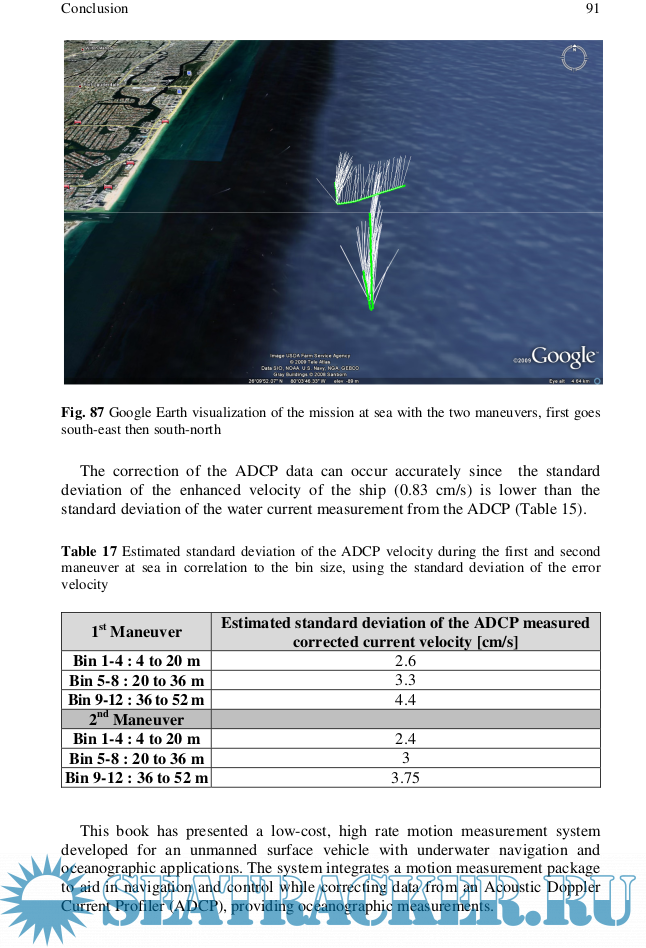 Year: 2013 Language: english Author: Chrystel Gelin Genre: Textbook / Research book Publisher: Springer International Publishing Edition: 1 ISBN: 978-3-642-32015-6 Format: PDF Quality: eBook Pages count: 112 Description: Dead-Reckoning aided with Doppler velocity measurement has been the most common method for underwater navigation for small vehicles. Unfortunately DR requires frequent position recalibrations and underwater vehicle navigation systems are limited to periodic position update when they surface. Finally standard Global Positioning System (GPS) receivers are unable to provide the rate or precision required when used on a small vessel. To overcome this, a low cost high rate motion measurement system for an Unmanned Surface Vehicle (USV) with underwater and oceanographic purposes is proposed. The proposed onboard system for the USV consists of an Inertial Measurement Unit (IMU) with accelerometers and rate gyros, a GPS receiver, a flux-gate compass, a roll and tilt sensor and an ADCP. Interfacing all the sensors proved rather challenging because of their different characteristics. The proposed data fusion technique integrates the sensors and develops an embeddable software package, using real time data fusion methods, for a USV to aid in navigation and control as well as controlling an onboard Acoustic Doppler Current Profiler (ADCP). While ADCPs non-intrusively measure water flow, the vessel motion needs to be removed to analyze the data and the system developed provides the motion measurements and processing to accomplish this task. Additional info: Springer Series on Naval Architecture, Marine Engineering, Shipbuilding and Shipping Vol.1