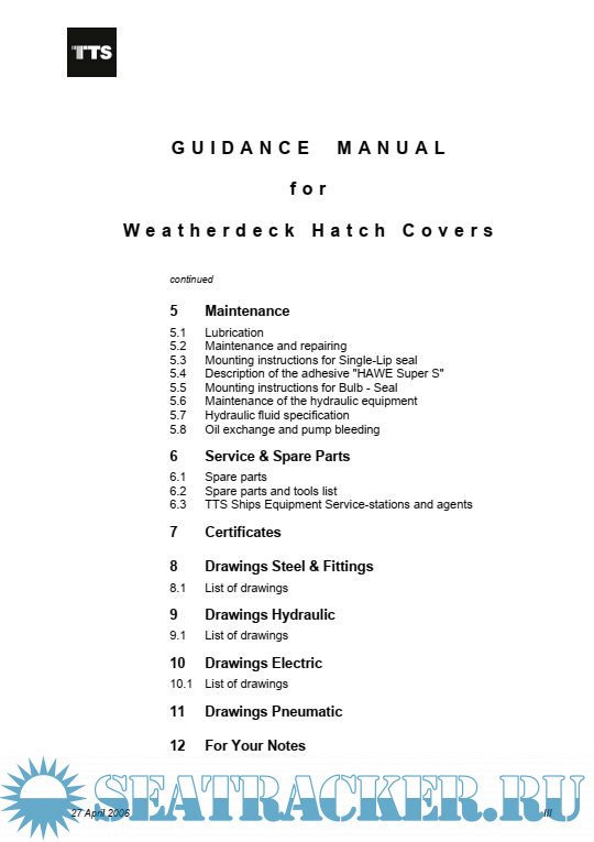 Description: This manual for TTS Ships Equipment hatch covers contains information especially for this equipment on technical data, installation, start-up, care and maintenance as well as spare parts ordering.