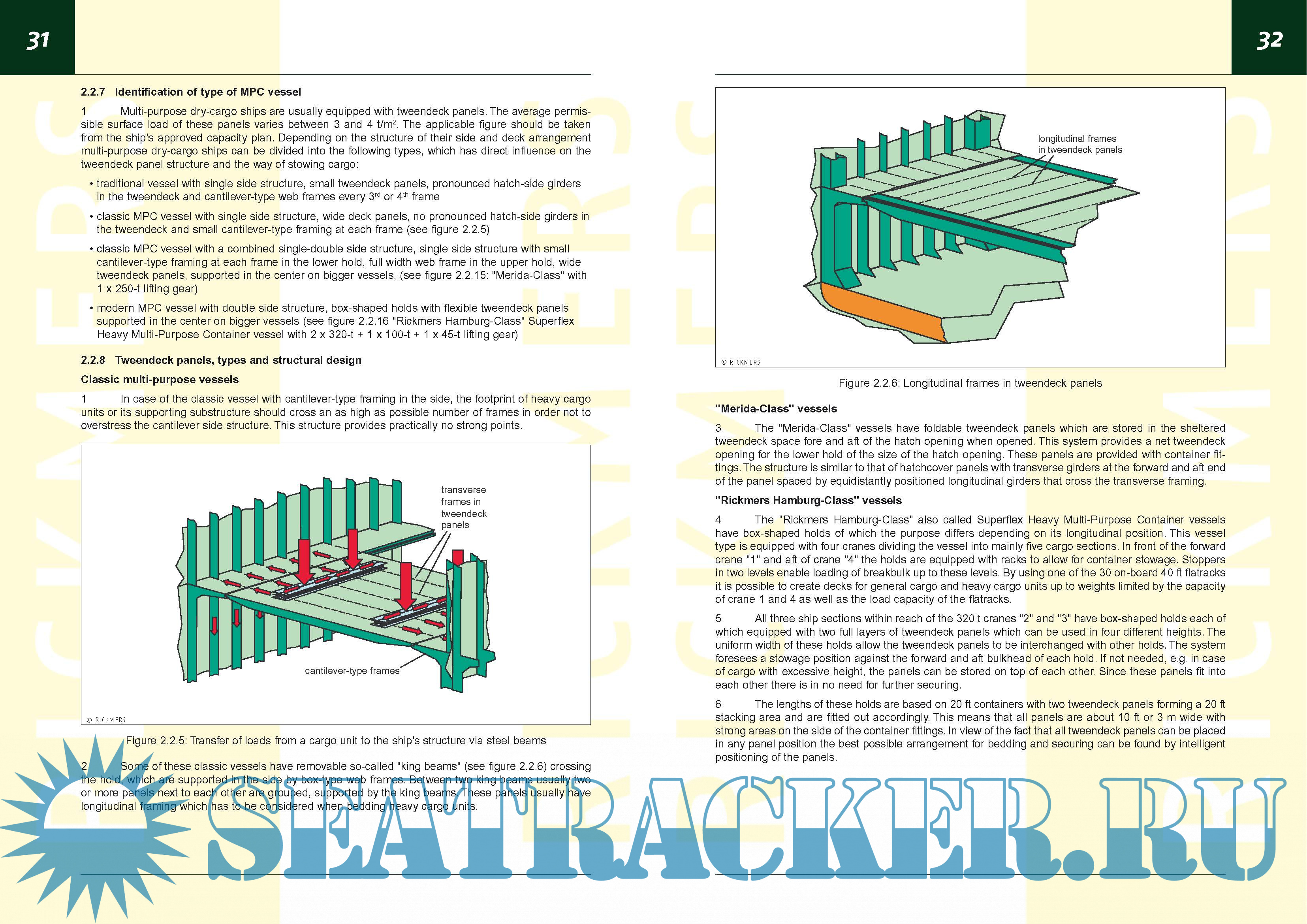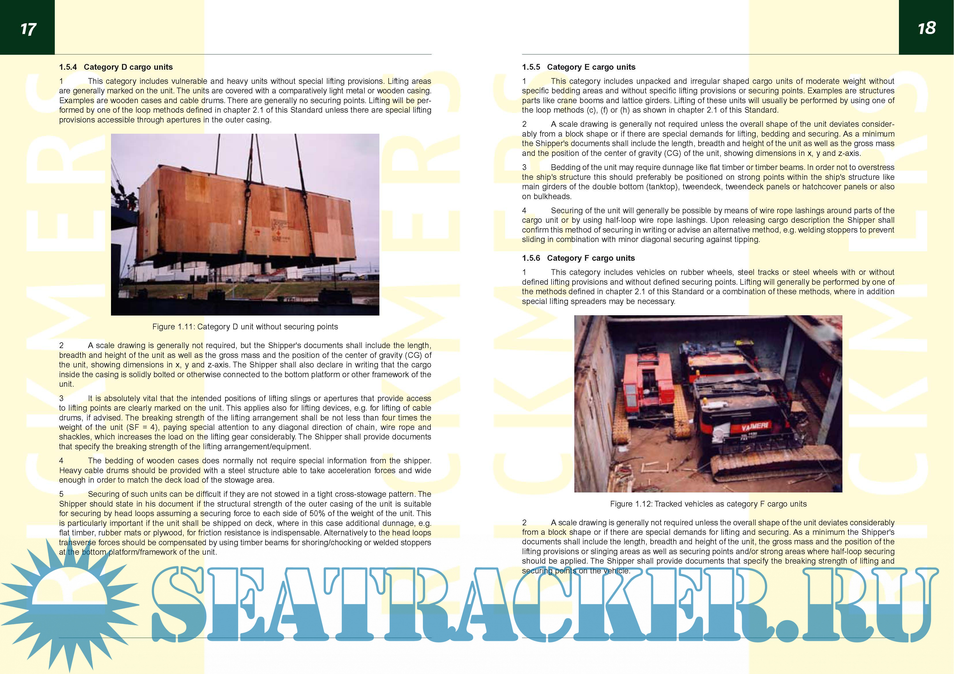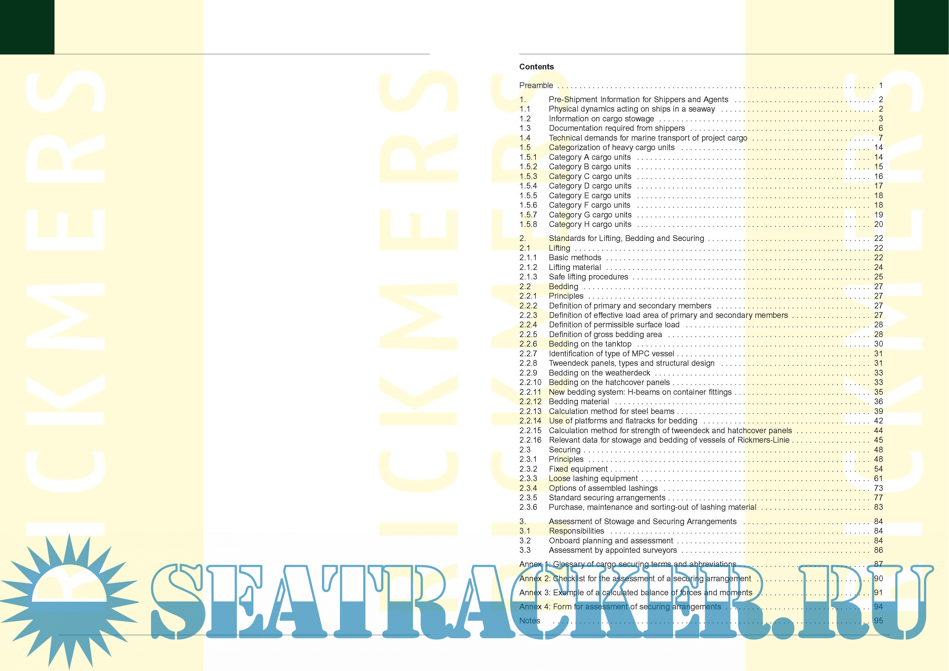 Year: 2003 Language: english Author: Rickmers-Linie GmbH & Cie. KG (Hamburg) Genre: Guide Publisher: Rickmers-Linie GmbH & Cie. KG (Hamburg) Edition: 3rd. Format: PDF Quality: OCR without errors Pages count: 52 Description: The spirit and purpose of this Standard is to inform shippers of cargo units, stevedores and supercargoes etc. about cargo handling and securing practices on board of the vessels sailing for Rickmers-Linie and to provide a specific update to masters and officers. Realizing that safety requirements do not necessarily contradict commercial aspects, the main objective of Rickmers-Linie is to increase the technical and commercial performance of marine transport by avoiding damage and loss of cargo, finally resulting in an improved safety at sea and protection of the marine environment. The Standard, in particular, provides detailed information about lifting, bedding and securing/lashing of cargo as well as the equipment used and its maintenance. The Standard further describes the cargo information to be supplied by shippers in accordance with Chapter VI, Regulation 2 of the SOLAS-Convention (see Ch 1.3) and the necessary configuration of lifting provisions, bedding areas and securing points. The desired securing point configuration and lashing scheme of the cargo corresponds with the tensile strength (MSL as per IMO) of the fixed and loose securing gear on board of the vessels and their deck lay-out.