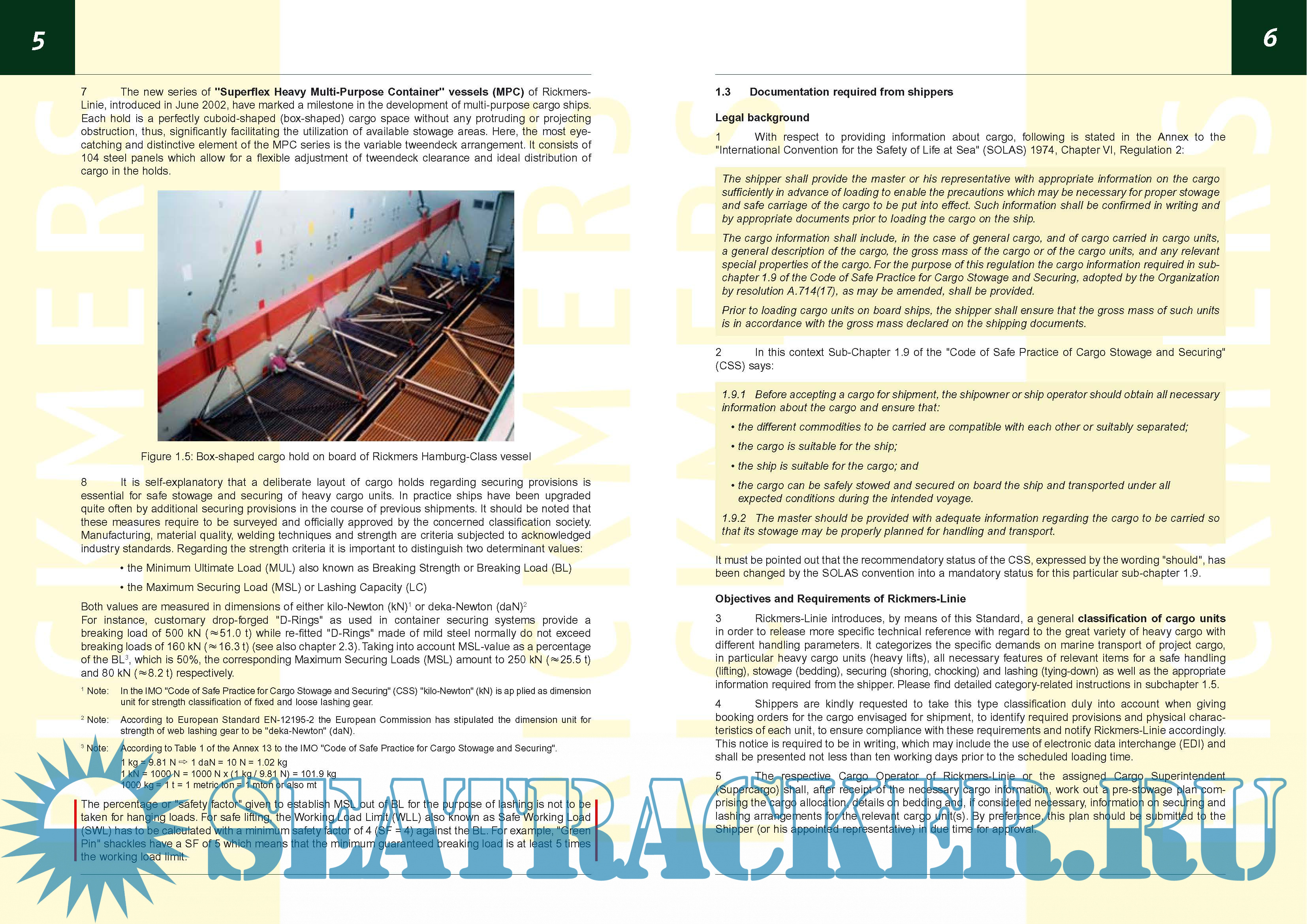 Realizing that safety requirements do not necessarily contradict commercial aspects, the main objective of Rickmers-Linie is to increase the technical and commercial performance of marine transport by avoiding damage and loss of cargo, finally resulting in an improved safety at sea and protection of the marine environment. The Standard, in particular, provides detailed information about lifting, bedding and securing/lashing of cargo as well as the equipment used and its maintenance.