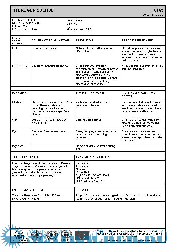 Description: Hydrogen sulfide (CAS No. 7783-06-4) is a colourless, flammable gas with a characteristic odour of rotten eggs. It is produced naturally and as a result of human activity. Natural sources include non-specific and anaerobic bacterial reduction of sulfates and sulfurcontaining organic compounds. Hydrogen sulfide is found naturally in crude petroleum, natural gas, volcanic gases, and hot springs. It is also found in groundwater. It is released from stagnant or polluted waters and manure or coal pits.