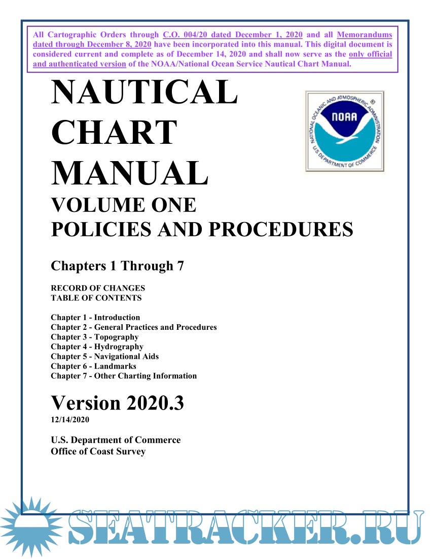 Year: 2020 Language: english Author: U.S. Department of Commerce, Office of Coast Survey Genre: Reference book Publisher: U.S. Department of Commerce, Office of Coast Survey Edition: 2020.3 - released on 14.12.2020, (Previous versions: 2019.1 2017.1) Format: PDF Quality: eBook Pages count: 890 (Volume 1); 1440 (Volume 2); 574 (Volume 3) Description: Volume 1: Policies and Procedures Chapters 1 Through 7 Table of contents Chapter 1 - Introduction Chapter 2 - General Practices and Procedures Chapter 3 - Topography Chapter 4 - Hydrography Chapter 5 - Navigational Aids Chapter 6 - Landmarks Chapter 7 - Other Charting Information Volume 2: Table of contents APPENDIX I – Definitions APPENDIX II – List of Charting Abbreviations APPENDIX III – Symbology APPENDIX IV - Miscellaneous References APPENDIX V - Cartographic Orders and Memoranda Volume 3: Digital Specifications Data Capture and Classification Guide