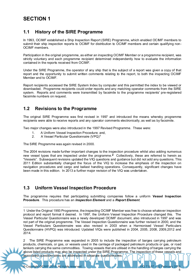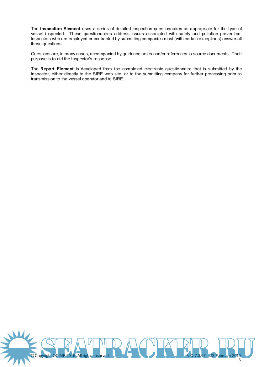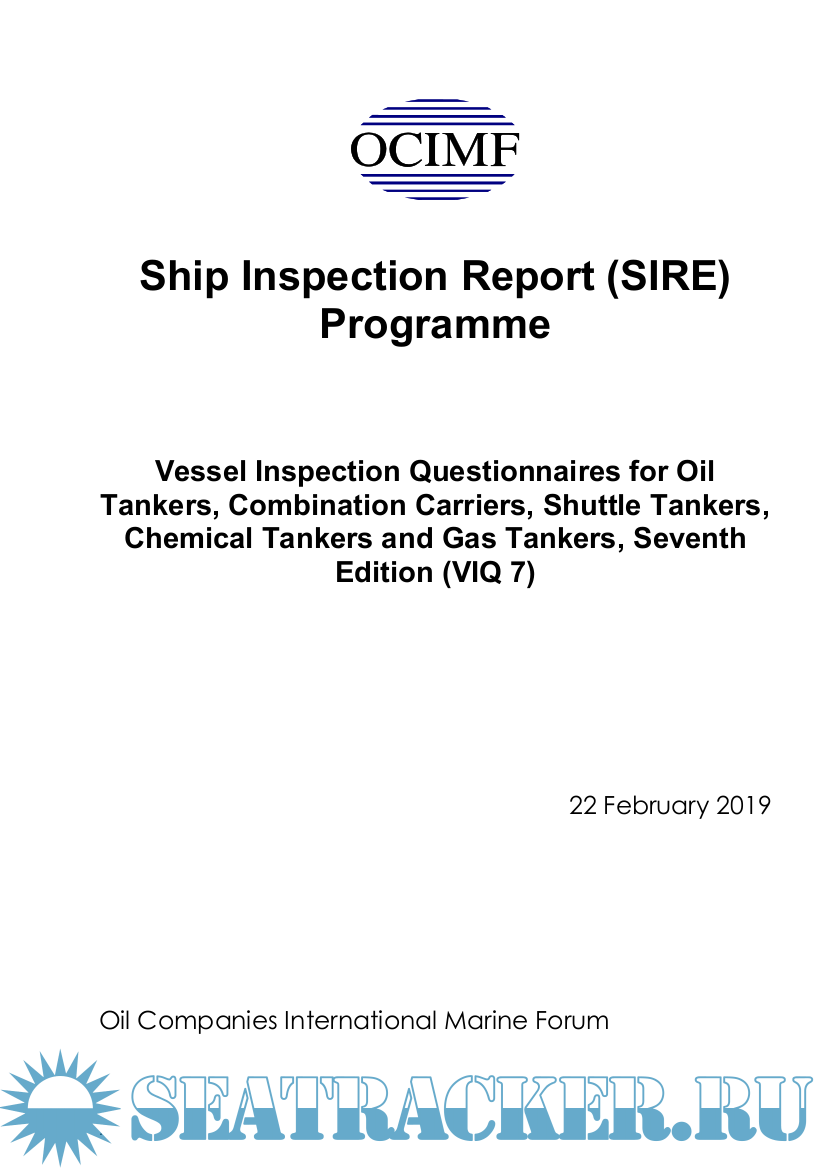 Description: Vessel Inspection Questionnaires for Oil Tankers,Combination Carriers, Shuttle Tankers, Chemical Tankers and Gas Tankers. (VIQ 7). In 1993, OCIMF established a Ship Inspection Report (SIRE) Programme, which enabled OCIMF members to submit their ship inspection reports to OCIMF for distribution to OCIMF members and certain qualifying non-OCIMF members.Participation in the original programme, as either an inspecting OCIMF Member or a programme recipient, was strictly voluntary and each programme recipient determined independently how to evaluate the information contained in the reports received from OCIMF.Under the SIRE Programme, the operator of any ship that is the subject of a report was given a copy of that report and the opportunity to submit written comments relating to the report, to both the inspecting OCIMF Member and to OCIMF.Report recipients accessed the SIRE System Index by computer and this permitted the index to be viewed or downloaded. Programme recipients could order reports and any matching operator comments from the SIRE system. Reports and comments were transmitted by facsimile to the programme recipients' pre-registered facsimile numbers on request.