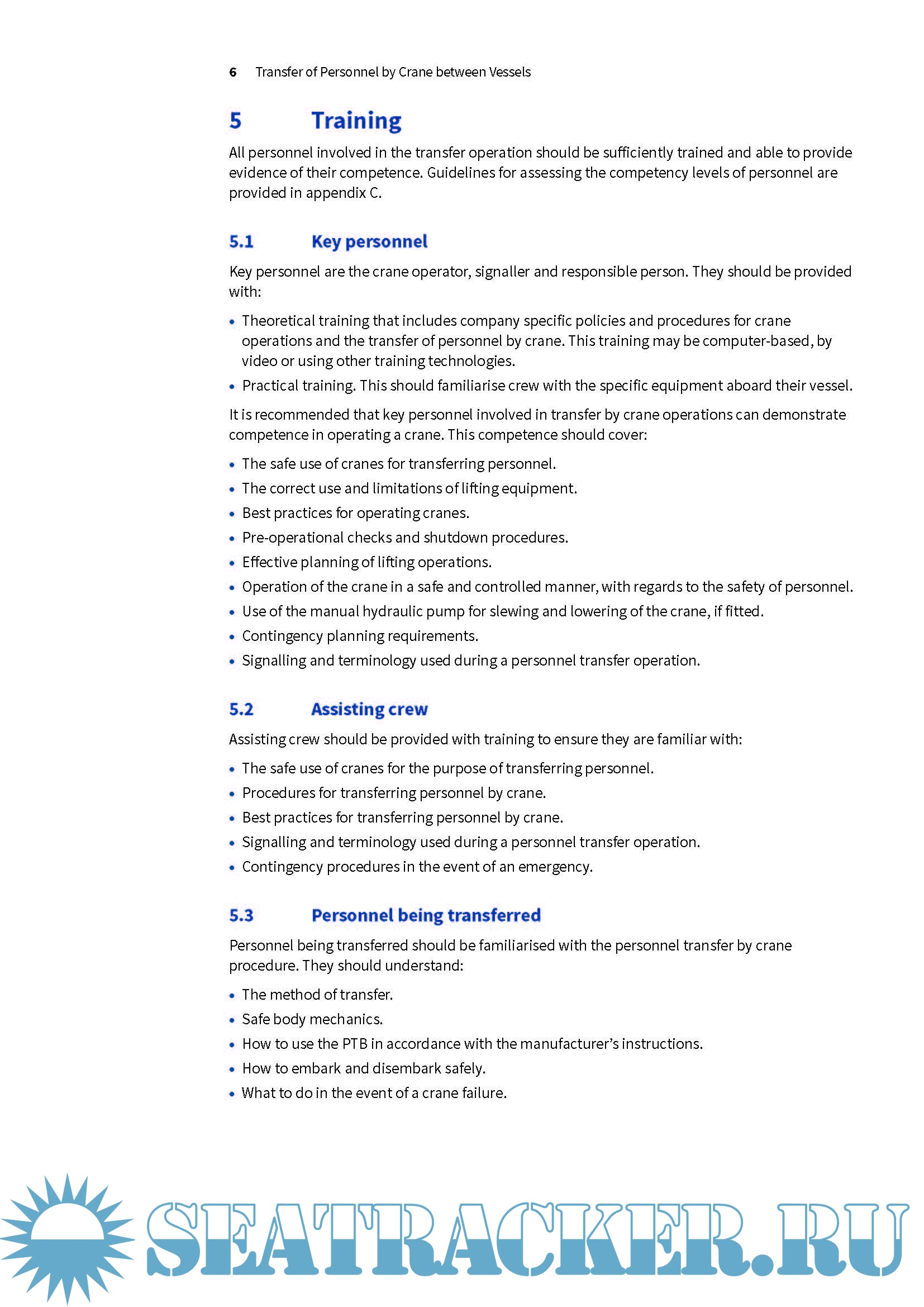 Year: 2018 Language: english Author: Oil Companies International Marine Forum Genre: Guide Publisher: OCIMF Edition: 1st Format: PDF Quality: eBook Pages count: 39 Description: This information paper is intended to help vessel operators and owners, Masters, officers, Marine Superintendents and Mooring Masters evaluate the risks associated with the transfer of personnel by a vessel’s onboard crane. The paper contains recommendations on equipment and good operating practices that will enhance the overall safety of personnel transfer operations. It is not a set of rules and if more stringent international, national or local regulations apply they must always take precedence. The use of an onboard crane for the transfer of personnel has inherent risks. This paper highlights those risks and provides guidance that should be used in the risk assessment process to determine the method of transfer. Cranes can be used to transfer personnel between two vessels of similar size, e.g. Ship to Ship (STS) transfers, but also between vessels of different sizes, e.g. between a large tanker and a smaller vessel. Crane transfers are typically completed using a Personnel Transfer Basket (PTB). In this paper, the term PTB is used to describe the piece of equipment in which personnel are transferred and includes collapsible basket and rigid capsule types.